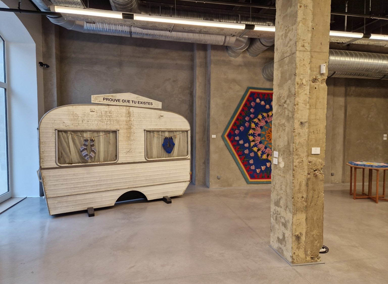 Comme une « bande à part » titre qu’il avait choisi pour une précédente exposition à Bruxelles en clin d’œil à Godart, à l’occasion de ses 40 ans de galeriste. Personnalité visionnaire et inclassable, Albert Baronian qui s’est orienté vers l’Arte povera et a favorisé l’internationalisation de la scène belge, entretient un rapport privilégié avec la France autour d’artistes de Support Surface mais aussi d’autres courants tels que Eric Poitevin, Yvan Salomone, Bruno Serralongue…le maître mot étant selon lui la subjectivité et le compagnonnage plutôt que la stratégie voire la spéculation selon les évolutions récentes du marché qu’il regrette. Alors pour cette exposition qui signe la nouvelle ligne et identité du CWB c’est vers des figures de résistance qu’il se tourne que ce soit dans les matériaux souvent modestes ou éphémères choisis que les messages délivrés. Pierre Ardouvin avec sa vielle caravane décatie qui ouvre le parcours en donne la tonalité avec cette injonction à contre-emploi tirée d’une chanson populaire « Prouve que tu existes ». Les girouettes ou totems extérieurs de Kamil Bouzoubaa-Grivel intitulés « Reverse Don Quixote » semblent également en petite forme. Ils voisinent avec l’une des œuvres marquantes de l’exposition d’Aline Bouvy, intitulée « Enclosure », dispositif aliénant du patriarcat. N’oublions pas que les hérétiques ce sont d’abord et avant tout ces sorcières du Moyen Age associées à la belladone, plante toxique aux vertus hallucinatoires que l’artiste avait convoqué lors de son exposition au MAC’s Grand Hornu et qui se voit réactivée dans la cour du CWB.
