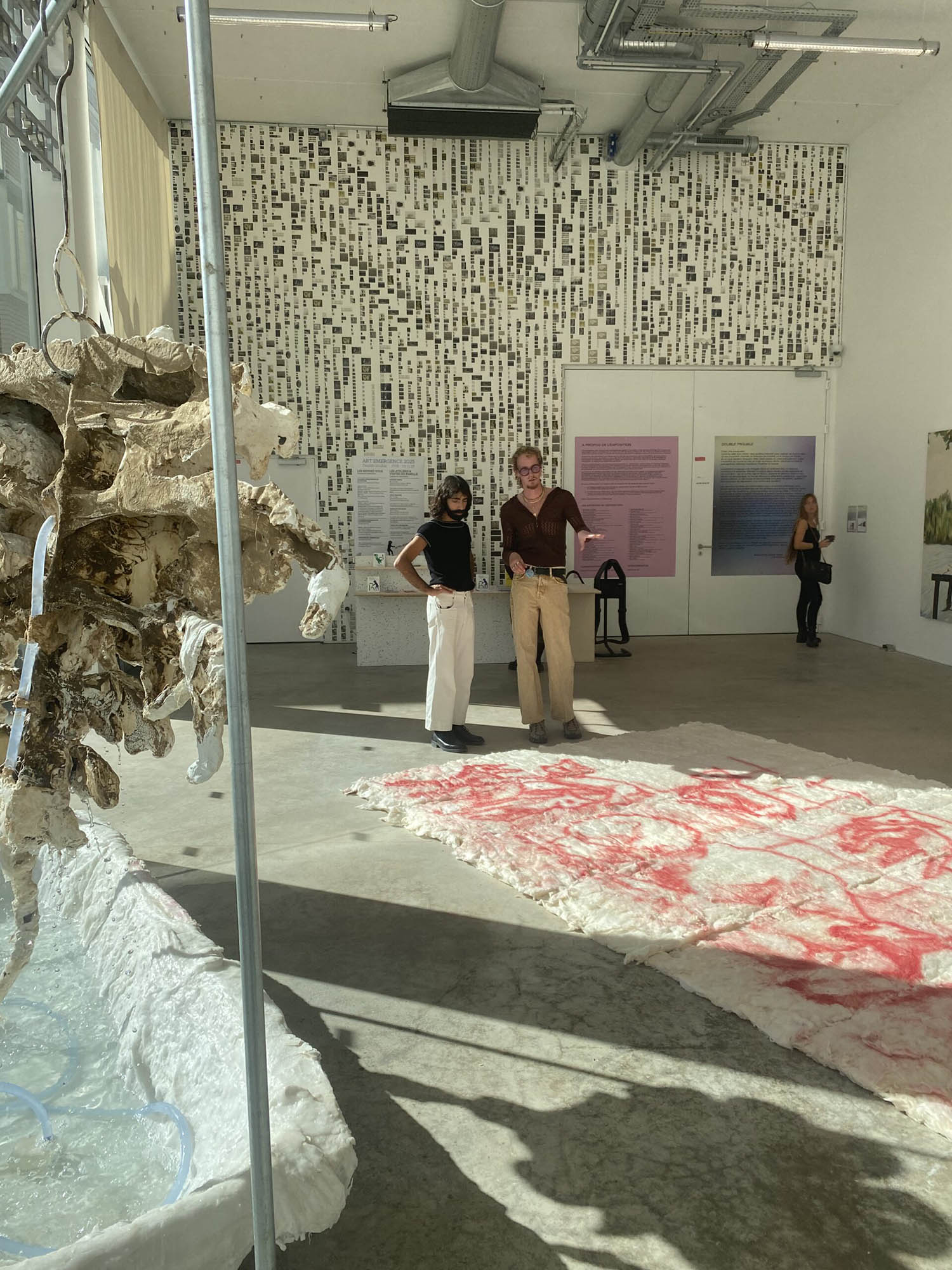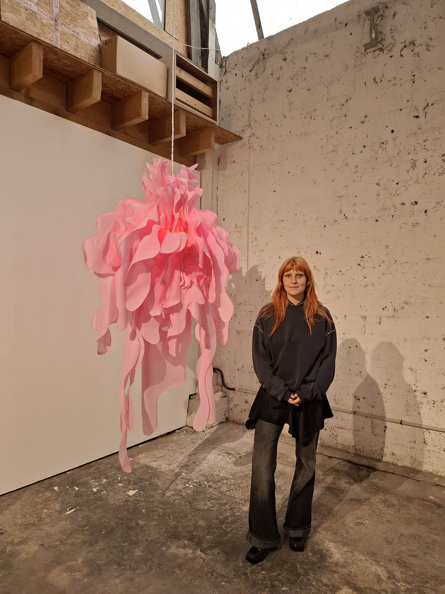 Salomé Fau, curatrice « Nymphs Just Wanna Have Fun » le Houloc 2025 devant l’oeuvre de Lucas Tortolano photo MdF