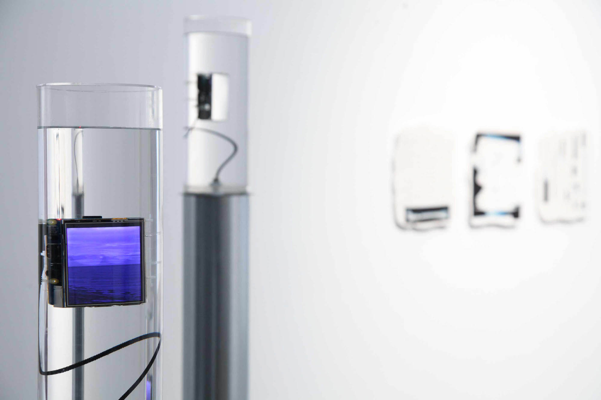 Des écrans data sont enfermés dans du liquide, de l’huile qui laisse circuler la technologie. Symboliquement très beau autour de cette idée du flux. Ce sont des vidéos de plages partout dans le monde que l’on voit en direct et qui tout d’un coup vont se brouiller. Elles sont captées par des caméras de surveillance. Il travaille le codage, le caractère éphémère des images, des bases de données. Il poursuit une sorte d’inventaire d’images qu’il puise sur internet et qu’il travaille ensuite par l’installation mais aussi le dessin.