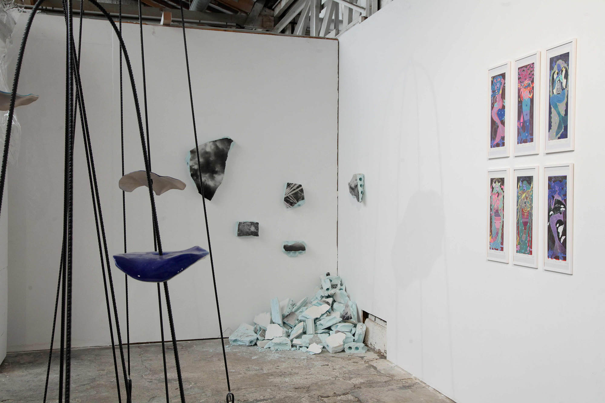 Vues de l’exposition « Nymphs Just Wanna Have Fun » curated par Salomé Fau pour le Houloc Copyright photos : Mathieu Roquigny pour le Houloc (installation de Célia Coëtte à gauche)