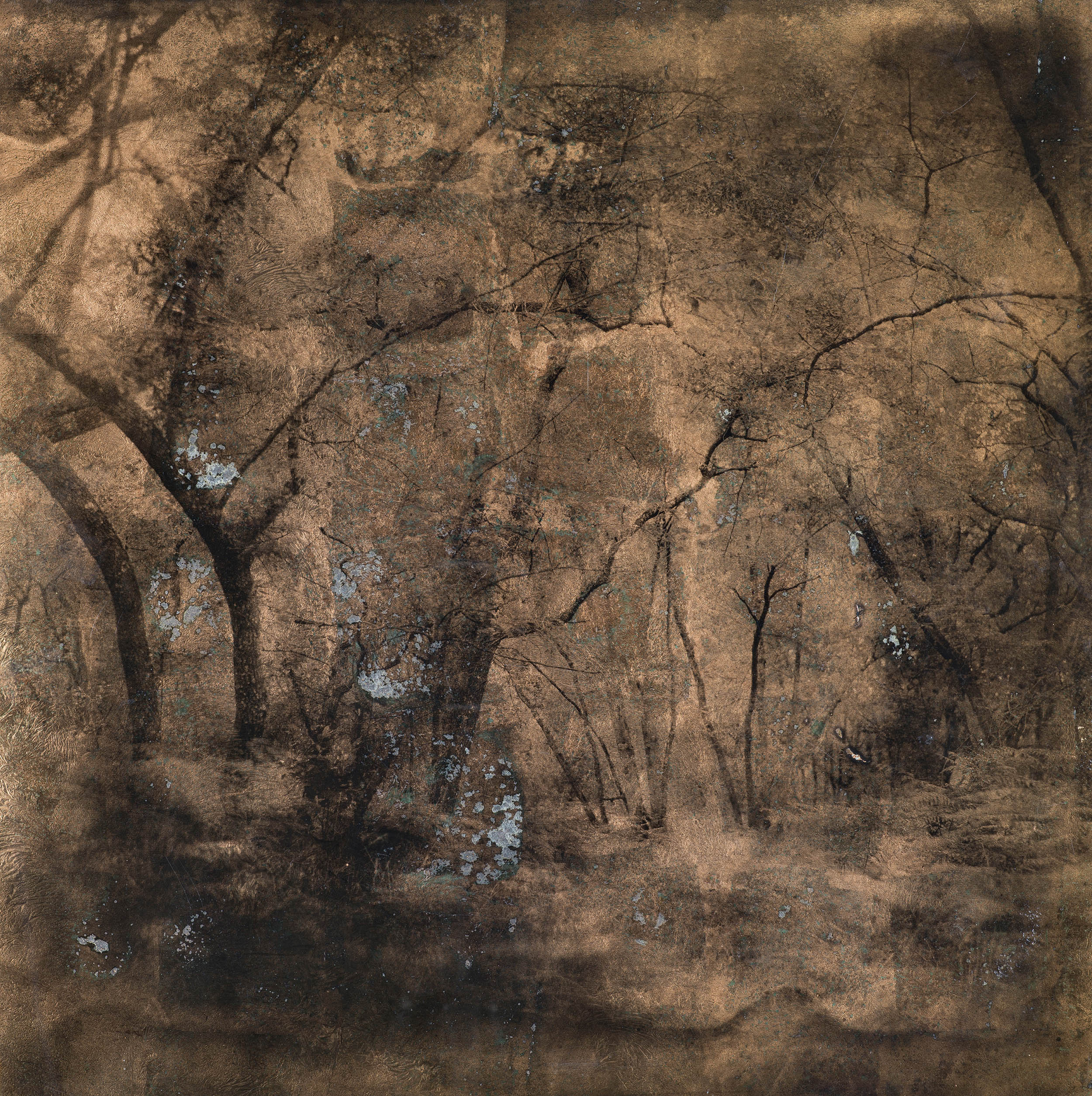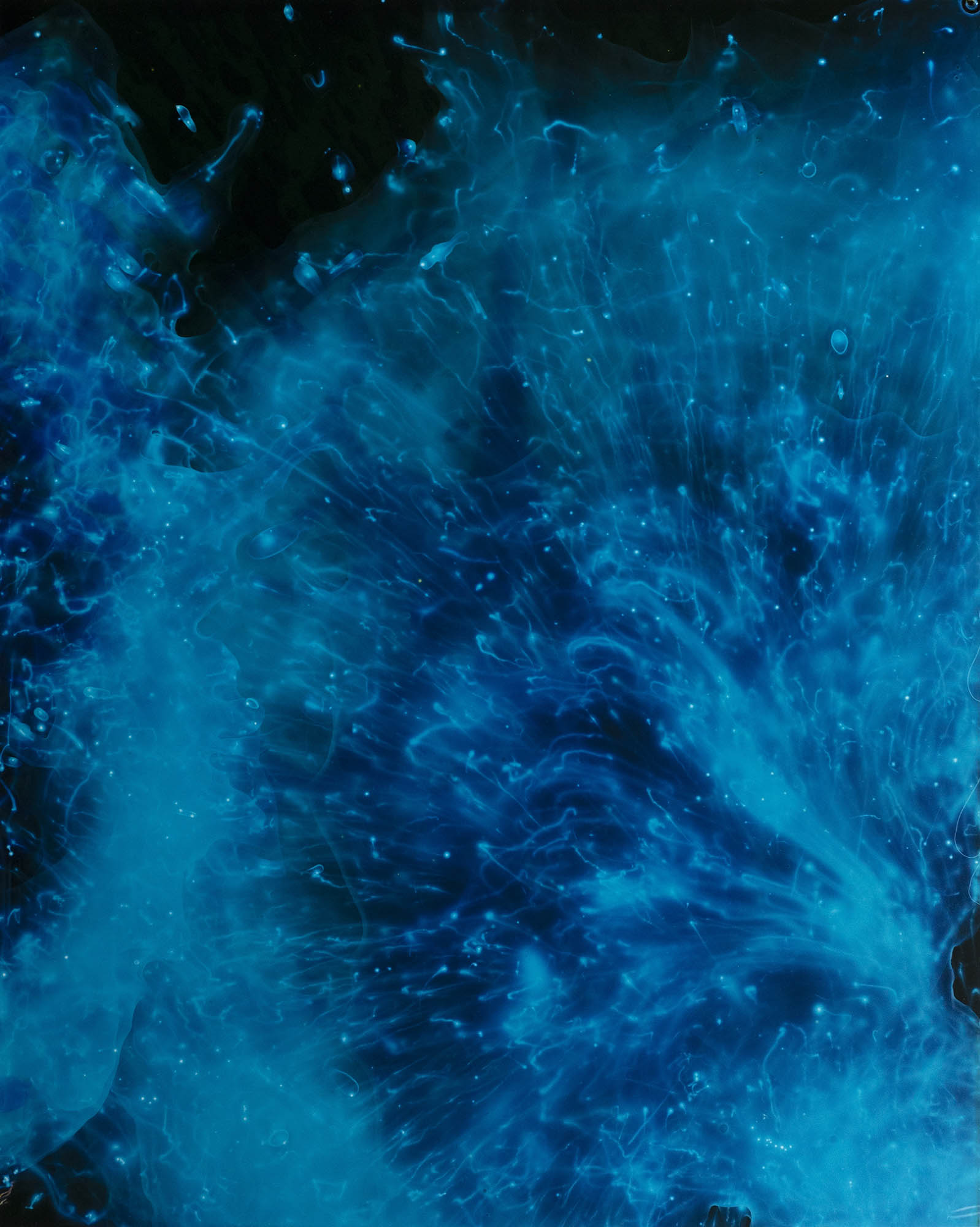 Pietro Bologna sculpte la lumière et la matrice : ses plaques rétro-éclairées, plis et déchirures font de la surface une mémoire tactile, et cette approche matérielle répond directement aux interventions textiles de Sabatina Leccia, qui transforme l’image par la broderie, la perforation et la superposition. Le traitement pictural et fragile de Sophie Le Gendre, qui froisse papiers japonais et joue avec la lumière, prolonge cette attention au geste et à la surface, tandis que Denis Félix invite à la lenteur avec des oxydotypes qui gardent la respiration et la mémoire des forêts. Isabelle Ehrler et Léonard Bourgois Beaulieu poussent plus loin l’idée du vivant dans l’image : l’une en intégrant des matières minérales qui « fossilisent » les tirages, l’autre en laissant des micro-organismes modifier la surface photographique, jusqu’à faire de l’image un organisme. Anna Katharina Scheidegger écrit la photographie avec la lumière du phytoplancton bioluminescent, un travail de visibilité du fragile qui trouve un écho poétique dans les cyanotypes rouges de Mimiko Türkkan, où le corps devient vague et mouvement. Daphne van de Velde explore, elle, le corps en volume avec des sculptures photographiques qui parlent de désir, d’isolement et de connexion. Julie Cockburn, par la broderie sur photographies anciennes, renouvelle la narration du passé; Reeve Schumacher, musicien et plasticien, remixe l’imagerie populaire en collages et performances, déplacement qui rejoint la pratique d’Émile Gostelie, qui déconstruit puis recompose l’image en mythologies visuelles. Sander Coers pose la question de la fiction à l’ère de l’IA, brouillant documentaire et invention, un questionnement proche des portraits-installations de Vincent Lemaire où histoire et invention se mêlent. Enfin, Thu Van Tran et Thomas Mailaender, présentés ensemble, offrent deux démarches complémentaires — paysages kaléidoscopiques chez l’une, réemplois d’objets et d’images chez l’autre.