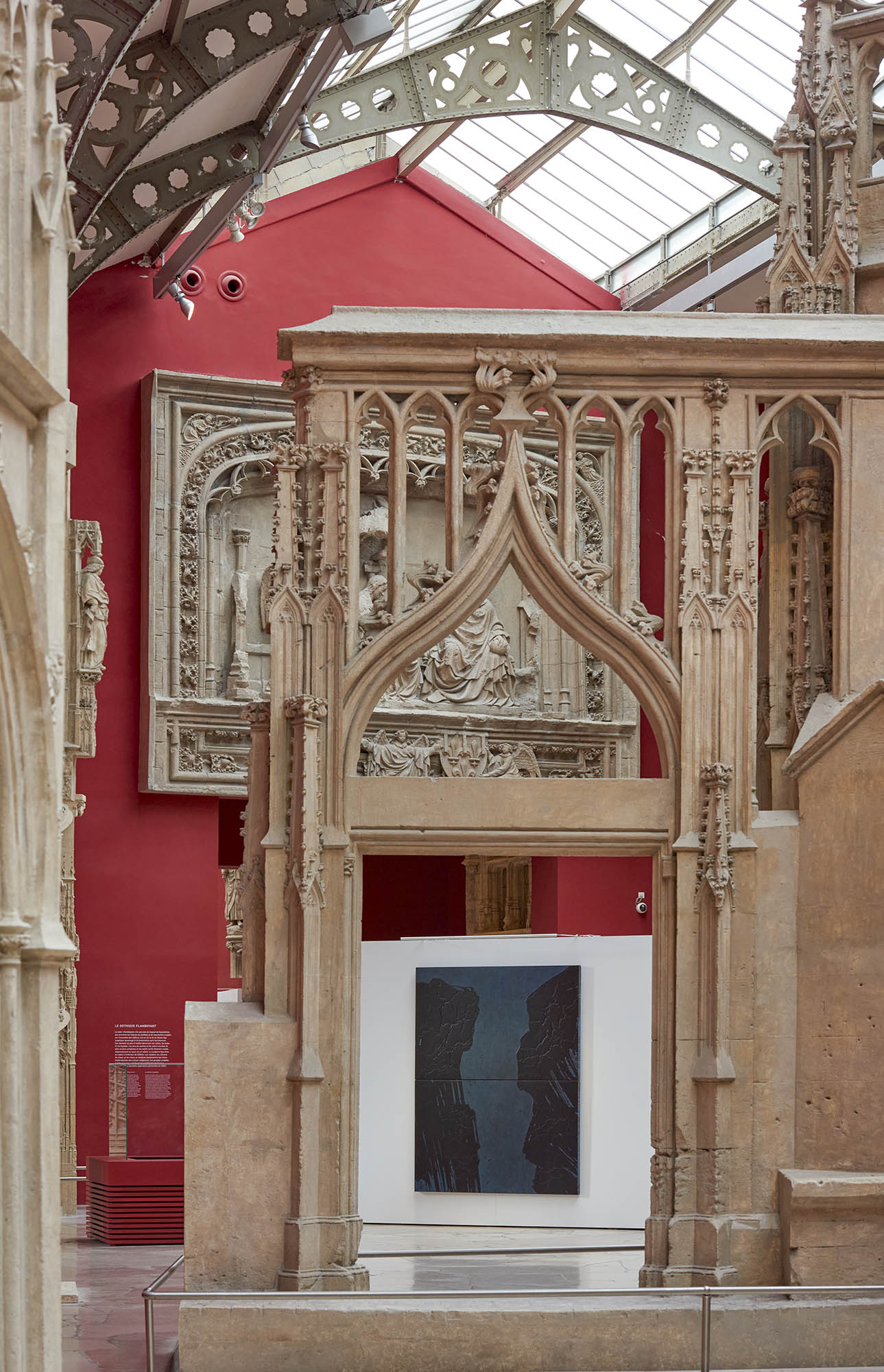 Le travail est fondé sur la peinture médiévale c’est pourquoi elle aurait pu être montrée à la galerie des peintures murales même si je trouvais intéressant de faire contraste entre le relief et la sculpturalité des formes peintres et les hauts reliefs des sculptures du Gothique flamboyant.