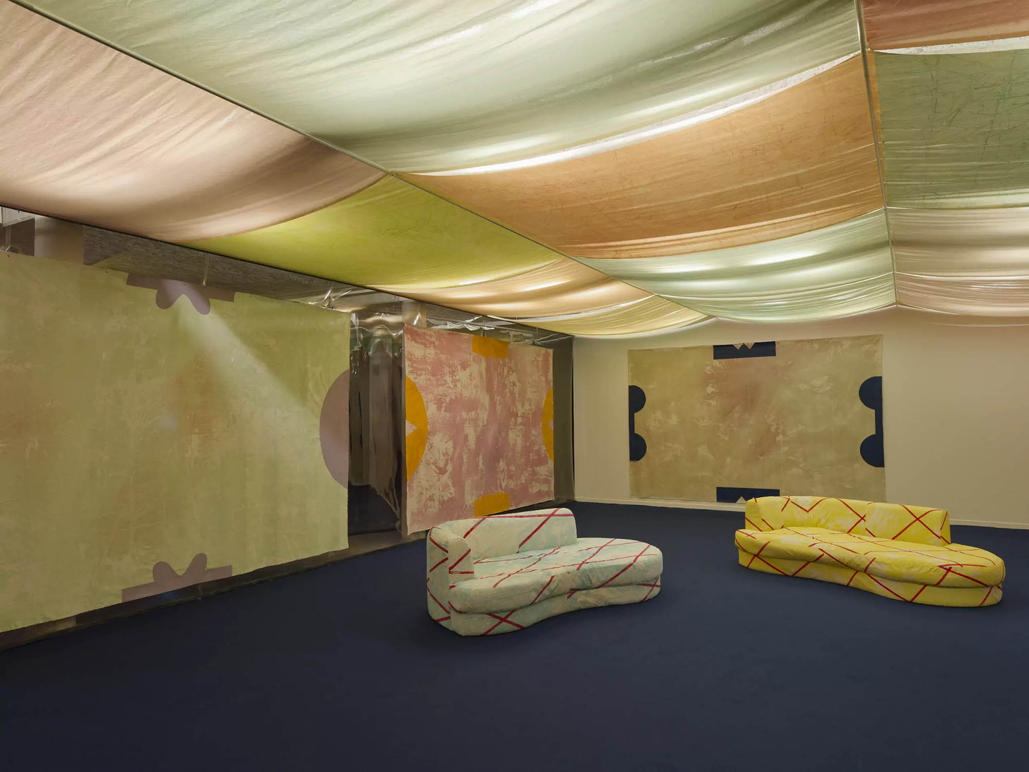 L’espace d’une totalité de 450 mètres carrés a un plafond assez bas (trois mètres de hauteur) et pas d’éclairage naturel. Des contraintes qui font partie du lieu. Mon objectif était de le ramener à des proportions plus acceptables, c’est-à-dire avoir un peu la sensation de rentrer dans une grotte, mais sans se sentir écrasé. L’envie de séparer l’espace d’exposition est venue assez rapidement, même si ce sont les quatre colonnes qui soutiennent le plafond qui m’ont amené à dessiner ce troisième espace entre une première partie plus sombre, dédiée à l’espace vidéo et la partie plus colorée, plus décorative où se trouvent les canapés.