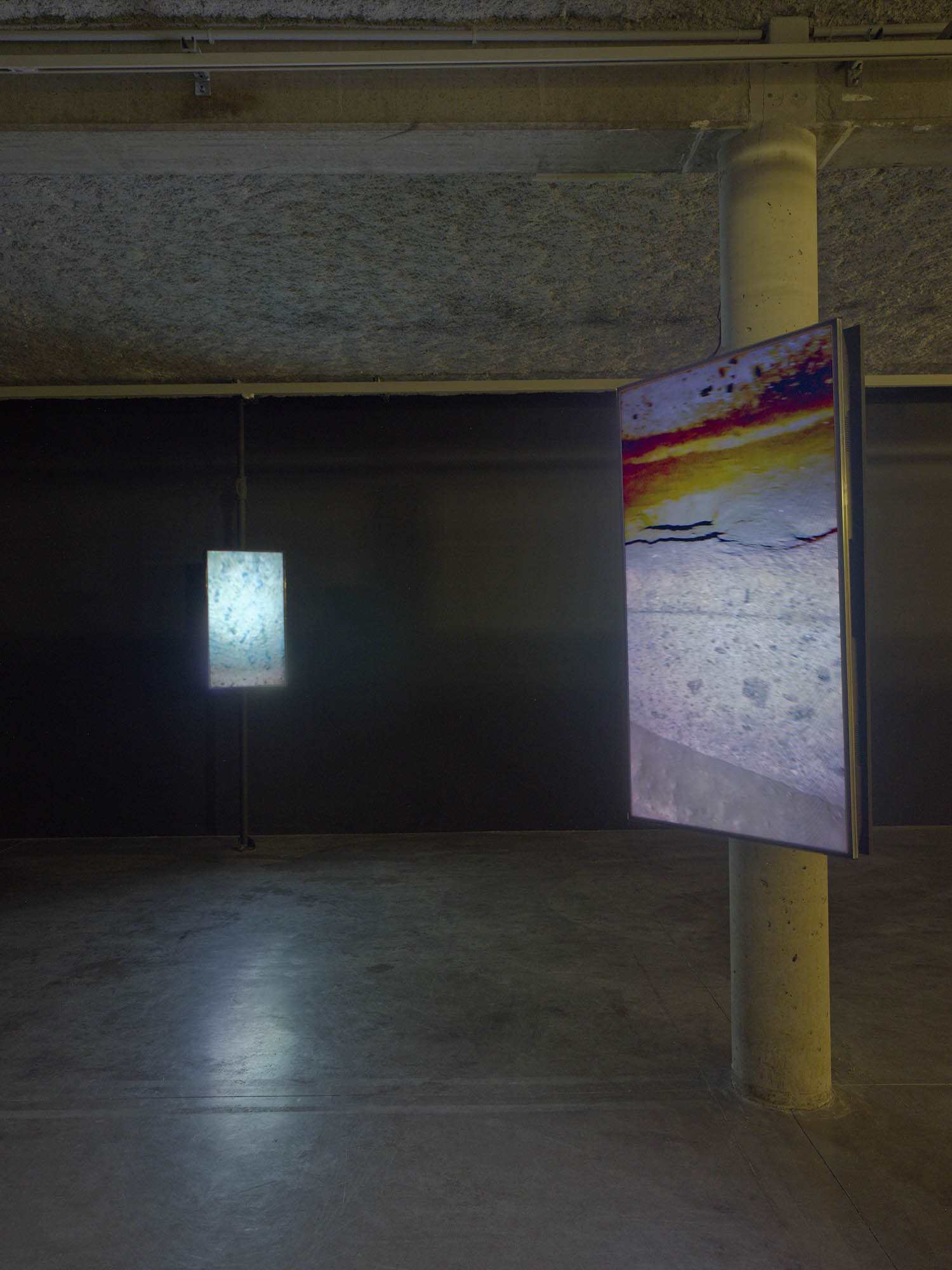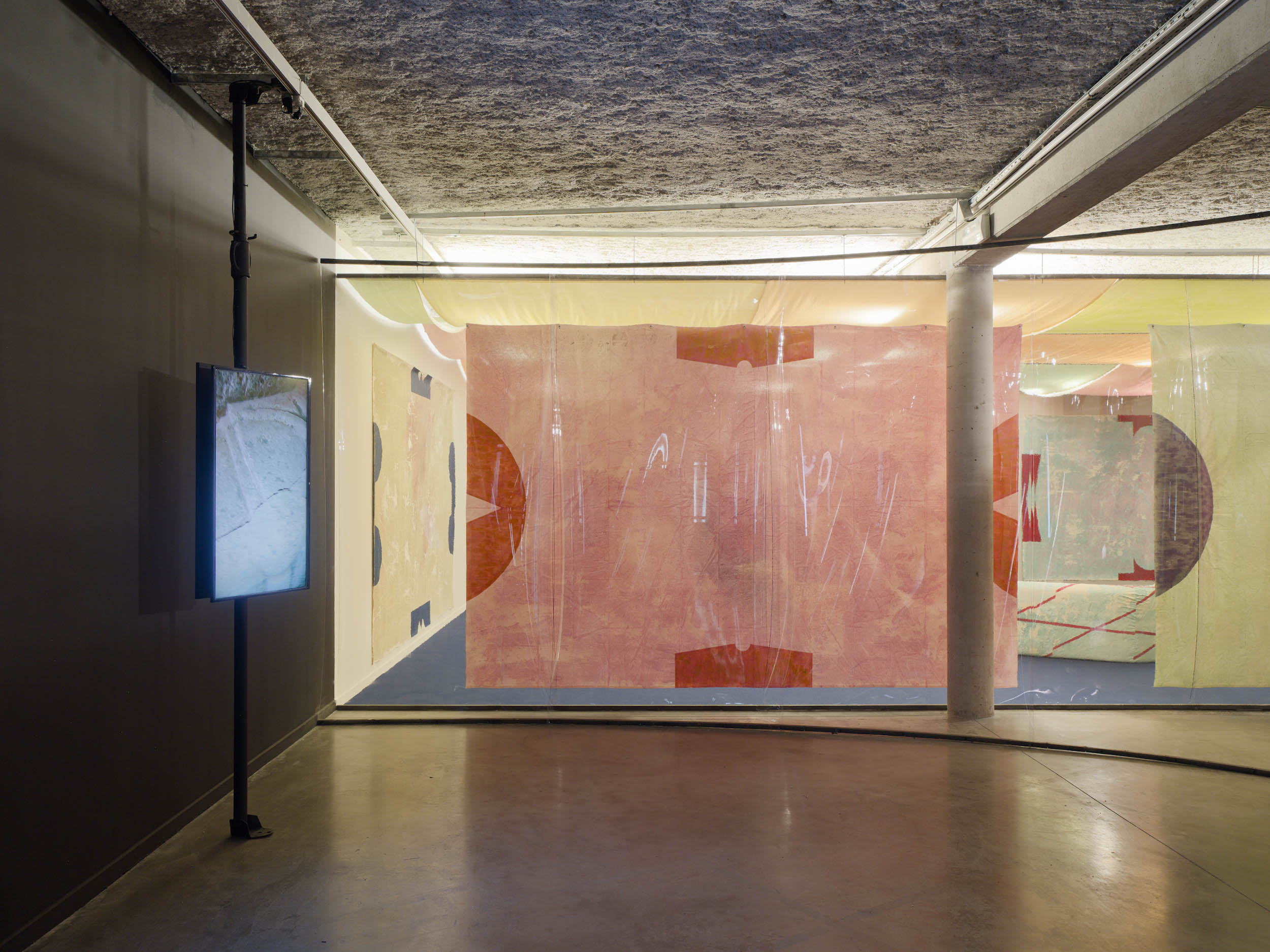 Les couleurs, sont venues du visionnage des vidéos. Des couleurs un peu acidulées, un peu pastels. Il y a quelque chose qui les rassemble. Comme une famille. En termes de procédé, ces toiles ont été réalisées au sol, sur une bâche de plastique, avec une peinture acrylique très diluée. Au séchage, l’air forme des plis révélant des compositions vibrantes et non contrôlées. Cette série de neuf peintures sur toile est inspirée de panneaux de marbre présents dans les églises romaines. L’installation « Plafond » complète le dispositif avec des toiles disposées à l’horizontal.