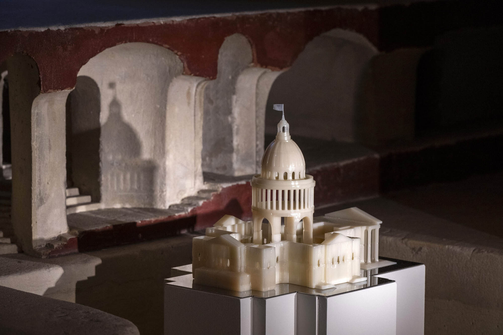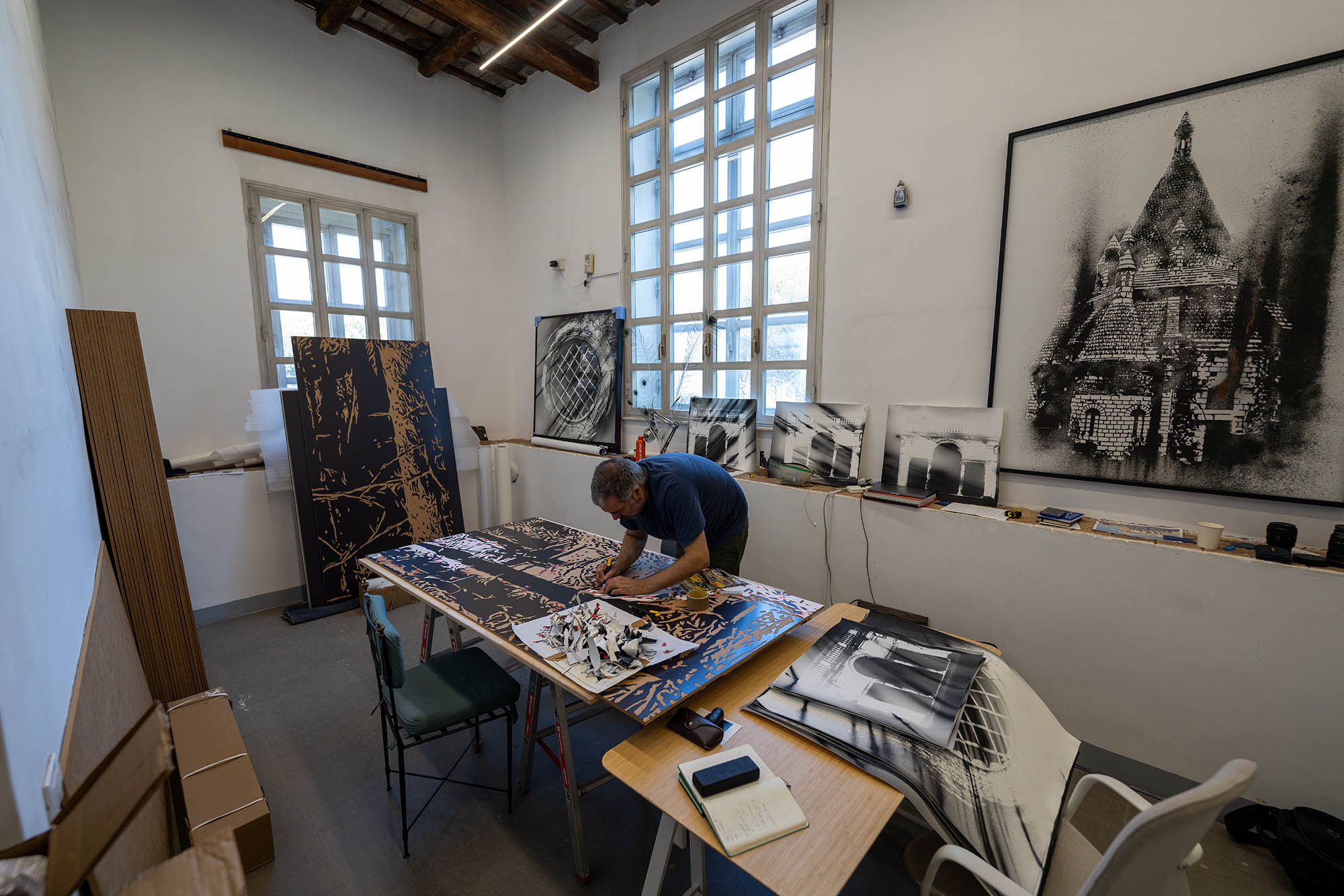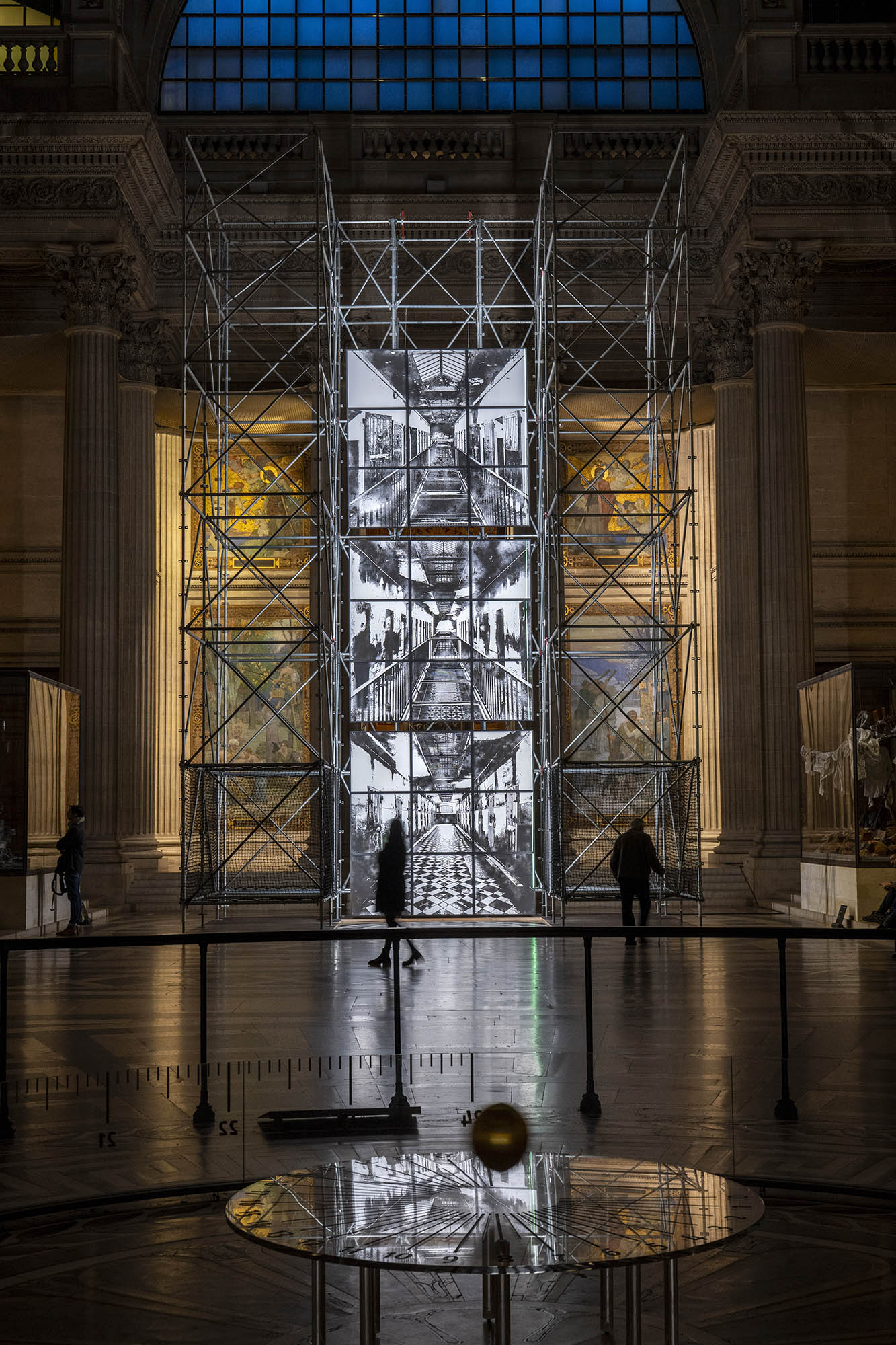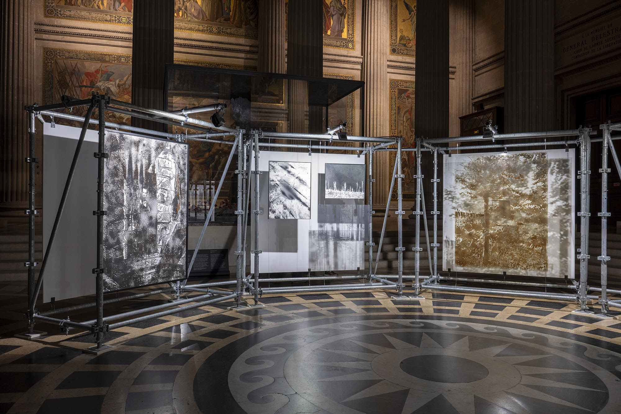 Partager Partager C’est une histoire de surgissent et de sidération, de monumentalité et de miniaturisation, d’éternité et de transitoire, de fixité et de déplacement. Nicolas Daubanes, dans le prolongement de ses recherches sur les hauts lieux de la mémoire nationale : Mémorial de Mont-Valérien, prison de Montluc, le camp de concentration de Natzweiler-Struthof, cristallise pour le Panthéon ces moments de bascule de l’histoire à travers de véritables reconstitutions à l’échelle 1/1 plaçant le spectateur au cœur du dispositif. Une dramaturgie qui repose sur la force du contraste entre la poudre noire de la limaille de fer qui ouvre sur le blanc. L’ombre et la lumière, l’aimantation et la corrosion, la fuite et la fragilité. En plus de ces « paysages-mémoire » l’artiste propose une mise en abyme de la maquette d’origine du Panthéon dans une version miniature en résine dentaire qui renvoie à la crypte et aux notions d’os et de reliquaire. Un renversement d’échelle et une obscurité qui contraste avec la lumière de la nef, tout comme le sont les personnes panthéonisées, même si elles continent à dégager une véritable aura comme le souligne l’artiste. Il revient sur les différents partis pris qui l’ont guidé face à ce défi monumental et les évidences imposées par le lieu lui-même. Il invite le visiteur à une véritable traversée autant symbolique que physique des corps. Nicolas Daubanes a répondu à mes questions. Nicolas Daubanes. portrait, photo A. Francin Tout d’abord, comment a été imaginé ce projet ? Comment avez-vous réagi à cette invitation ? Ce projet a surgi après les différentes pérégrinations dans les espaces mémoriels et les diverses résidences et expositions que j’ai pu réaliser. La question s’est posée de tout réunir dans un lieu tel que le Panthéon. Face à une telle invitation, on a tout d’abord un temps de sidération, qui est redoublé au moment de la visite où l’on se demande comment on va se saisir d’un tel espace. Très vite on réalise qu’en fait ce n’est pas nous qui allons prendre l’espace mais proposer des œuvres que le Panthéon accepte. Un phénomène est assez différent d’un autre lieu. Après, tout simplement, il faut y aller avec de la sérénité, étape par étape et questionner le lieu et son inscription dans le temps. En tous cas, c’était un challenge vraiment très intéressant. Nicolas Daubanes à l’atelier. photo A. Francin Allons vers ce qui ressemble à un panorama avec « Un paysage tranquille » qu’est-ce qui se joue ici ? En fait, j’avais l’envie d’avoir un espace plus réduit dans lequel le spectateur pouvait se retrouver non pas enfermé, mais on va dire, ceinturé autour d’une succession de points de vue mêlant plusieurs lieux de la mémoire nationale que j’ai traversés. C’est ce que permet la structure octogonale du panorama. La plupart des dessins qui sont réunis sont les témoignages de mes passages dans ces lieux comme à l’Abbaye de Fontevraud, dans laquelle j’ai travaillé pendant quasiment deux ans, puis à Mont-Dauphin, village fortifié au cœur des Alpes ou l’ancien camp de concentration de Natzweiler-Struthof qui est évoqué avec un dessin qui, soumis à la pluie, au vent, au soleil… se trouve complètement oxydé. Ce que l’on pourrait appeler des « paysages mémoire ». Le panorama, de plus, est l’archétype du dispositif de l’image racontant la guerre. L’intérêt était aussi de montrer diverses techniques avec les photogrammes qui sont une technique tout à fait récente pour moi, les dessins sur verre, les dessins sur papier… Comme une pluralité de langages. vue de l’exposition « Ombre est lumière. Mémoires des lieux » de Nicolas Daubanes au Panthéon avec : Ancien camp de concentration de Natzweiler-Struthof, forêt. 2025 et : Mont-Valérien, 2025. © Nicolas Daubanes – Adagp, Paris. Crédit photo Didier Plowy – CMN Le parcours ouvre avec « Le Mont-Valérien » et l’Ancien camp de Natzweiler-Struthof comme pour planter le décor. Comment avez-vous décidé le placement de chaque œuvre et la scénographie d’ensemble ? Ce qui est assez intéressant c’est que le Panthéon lui-même vous montre un peu les espaces. C’est à dire qu’on a ces marches qui sont dans la nef et qui offrent à gauche et à droite des surfaces d’exposition assez naturelles puis une autre volée de marches et de colonnes avec comme une sorte de parvis qui se dessine. Face à ce parvis, j’ai réalisé que c’était ici que j’allais installer mes pièces dans la nef et utiliser cet espace pour permettre aux spectateurs de poser leur regard. Des pièces qui ne montent pas trop en hauteur même si c’est relatif au Panthéon. Finalement il est assez vain de tenter d’être en rivalité avec le Panthéon, ça ne sert absolument à rien ! Nicolas Daubanes, Même un paysage tranquille © Daubanes – Adagp, Paris. Crédit photo Didier Plowy – CMN Il y a une notion d’échafaudage qui ressort fortement avec les dessins sur 3 niveaux de Montluc. Une volonté de votre part d’afficher cette ossature qui rejoint celle de l’espace carcéral ? En effet. On a des grandes lignes horizontales, verticales, diagonales qui traversent de manière assez radicale l’espace visuel qui nous est proposé. Dans les dessins, c’est la même chose on a quatre grandes diagonales qui viennent trancher le dessin, quasiment le lacérer. L’échafaudage permettait de désigner une sorte de U au sol qui dessine l’entrée du couloir à échelle réelle. On a cette sensation de la verticalité de la prison. C’est aussi l’idée de la construction temporaire que je trouvais intéressante placée au-dessus de l’emplacement du caveau de Jean Moulin. Ces échafaudages participent à une certaine théâtralisation du Panthéon. Nicolas Daubanes, Prison de Montluc à Lyon, bâtiment cellulaire, trois niveaux © 