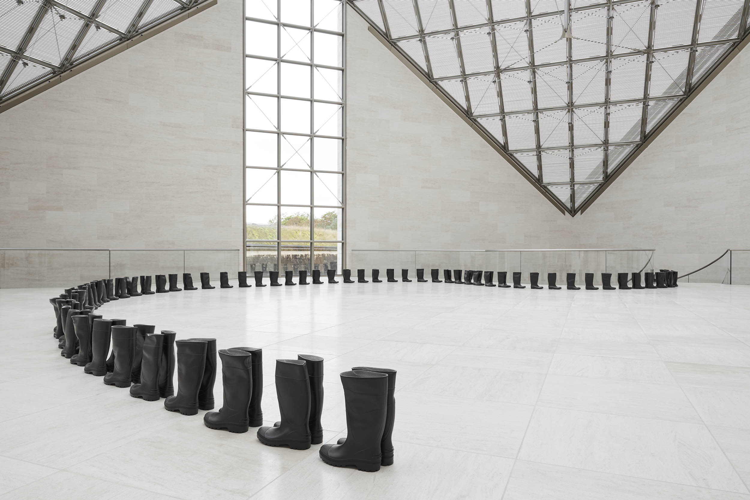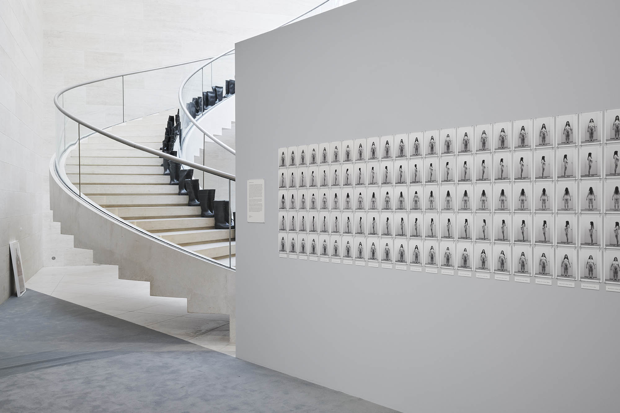 Partager Partager L’un des temps forts de la Luxembourg Art Week 2025 se jouait au Mudam autour de l’exposition de l’artiste militante états-unienne Eleanor Antin, une première en Europe, avec notamment l’œuvre pionnière Carving: A Traditional Sculpture, (1972) documentant son évolution physique en 144 photographies noir et blanc et 37 jours de régime à partir d’un système de grille et de taxinomie du corps féminin soulignant de façon précoce, l’impact du male gaze et des normes de beauté. Vue d’exposition Eleanor Antin : A Retrospective, 26.09.2025 — 08.02.2026,Mudam Luxembourg – Musée d’Art Moderne Grand-Duc JeanPhoto : Mareike Tocha © Mudam Luxembourg Vue d’exposition Eleanor Antin : A Retrospective, 26.09.2025 — 08.02.2026,Mudam Luxembourg – Musée d’Art Moderne Grand-Duc JeanPhoto : Mareike Tocha © Mudam Luxembourg L’œuvre iconique des 100 Bottes, son alter ego The Ballerina, le portrait à la barbe, The King, son panthéon féminin avec la section Admiration (Yvonne Rainer, notamment), rien ne manque dans cette ambitieuse célébration de 5 décennies d’une pratique plurielle,subversive et engagée. Mais je dois dire que selon moi les surprises se jouent plus du côté du nouvel accrochage des collections qui sous un aspect rigoureusement minimal et conceptuel, cache de nombreuses prises de position par ces créatrices. Un écho à la démarche d’Antin dans une réelle cohérence. Vue d’exposition Eleanor Antin : A Retrospective, 26.09.2025 — 08.02.2026,Mudam Luxembourg – Musée d’Art Moderne Grand-Duc JeanPhoto : Mareike Tocha © Mudam Luxembourg Sous le titre un peu énigmatique Radio Luxembourg: Echoes across borders, ce nouveau display de la collection conçu par les commissaires Marie-Laure Farcy et Wilhelm Schürmann met en lumière plusieurs générations d’artistes femmes, nées en Europe et aux États-Unis entre 1930 et 1991. Réunissant des œuvres récemment entrées dans la collection grâce à la donation des collectionneurs allemands Gaby et Wilhelm Schürmann, avec le soutien des membres du Cercle des collectionneurs du Mudam Luxembourg, aux côtés de pièces déjà présentes, cette présentation renforce le rôle des artistes femmes au sein de la collection du musée. Le choix du titre renvoie à l’ancêtre de RTL, dont l’âge d’or après-guerre a marqué de nombreux auditeurs au-delà du Luxembourg. Vue d’exposition Eleanor Antin : A Retrospective, 26.09.2025 — 08.02.2026,Mudam Luxembourg – Musée d’Art Moderne Grand-Duc JeanPhoto : Mareike Tocha © Mudam Luxembourg La pratique de la sculpture est déterminante dans ce panorama comme creuset d’une mémoire individuelle et collective dans une remise en cause des discours politiques dominants et des assignations. Vue d’exposition Radio Luxembourg: Echoes across borders, 04.04.2025 — 11.01.2026,Mudam Luxembourg – Musée d’Art Moderne Grand-Duc JeanPhoto : Mareike Tocha © Mudam Luxembourg L’une des œuvres qui se détache à l’entrée du parcours de l’artiste new yorkaise Jessica Diamond avec ce slogan « I Hate Business » s’attaque aux logiques du marché de l’art à New York dans les années 1980 et du capitalisme en général. Des mots écrits à la main directement sur la cimaise et un fond peint reprenant l’esthétique du graffiti déplacé dans le cadre muséal. D’une grande efficacité. Vue d’exposition Radio Luxembourg: Echoes across borders, 04.04.2025 — 11.01.2026,Mudam Luxembourg – Musée d’Art Moderne Grand-Duc JeanPhoto : Mareike Tocha © Mudam Luxembourg Puis le grand escalier de secours désarticulé de l’artiste polonaise Monika Sosnowska, fiché entre le sol et le plafond, sorte de memento mori échappé d’une catastrophe renvoie aux immeubles de la Pologne sous l’ère communiste et à l’architecture moderniste. Comme une ruine orpheline de son récit. En écho l’artiste allemande Charlotte Posenenske qui avait l’objet d’une magistrale exposition au Mudam en 2020 avec ses sculptures modulaires impose une forme de radicalité immédiatement reconnaissable. Réalisées en tôles d’acier galvanisé, elles s’adaptent aux différentes contextes d’exposition et lieux publics dans une dimension participative qui va à l’encontre de la signature et toute puissance de l’artiste. Vendues à prix coûtant et produites en usine, elles s’érigent contre les principes dominants l’économie de l’art. L’installation sonore de l’artiste croate Nora Turato imaginée à l’occasion de Manifesta 12 à Palerme lors d’une performance, intrigue et déroute. Son architecture grillagée entre cage ou vestiaire sportif est à la fois la scène des performances et un lieu d’échange avec ce large banc où l’on peut s’asseoir. Vue d’exposition Radio Luxembourg: Echoes across borders, 04.04.2025 — 11.01.2026,Mudam Luxembourg – Musée d’Art Moderne Grand-Duc JeanPhoto : Mareike Tocha © Mudam Luxembourg Vue d’exposition Radio Luxembourg: Echoes across borders, 04.04.2025 — 11.01.2026,Mudam Luxembourg – Musée d’Art Moderne Grand-Duc JeanPhoto : Mareike Tocha © Mudam Luxembourg Vue d’exposition Radio Luxembourg: Echoes across borders, 04.04.2025 — 11.01.2026,Mudam Luxembourg – Musée d’Art Moderne Grand-Duc JeanPhoto : Mareike Tocha © Mudam Luxembourg Autre artiste croate établie à Bruxelles Hana Miletić qui mêle art minimal et textiles qu’elle transforme et rapièce. A partir de la photographie, son laboratoire original en quelque sorte, qu’elle compare volontiers à la technique du tissage. En résulte des rafistolages retenus par de l’adhésif directement au mur à l’image des réparations observées dans l’espace public. Des négligences qui échappent souvent à notre système de valeur. Dans une même abstraction l’artiste américaine Hendl Helen Mirra s’inspire des vues depuis les fenêtres d’un moulin à vent au Royaume-Uni pour 