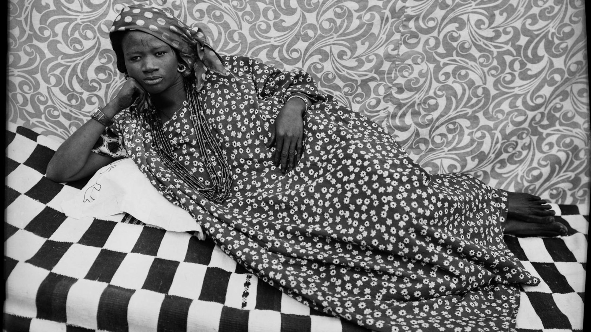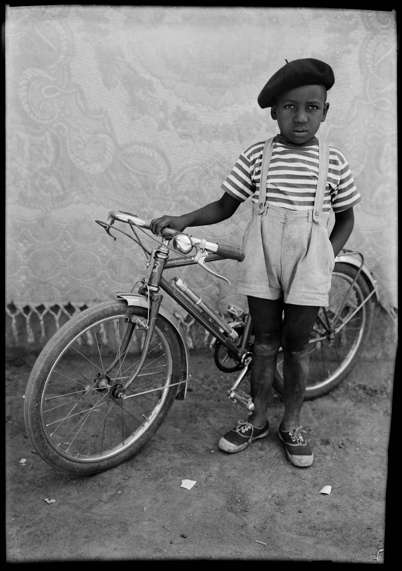 Partager Partager Pour sa deuxième carte blanche éditoriale, notre invitée de la semaine, la poète, écrivaine et historienne de la photographie Carole Naggar, basée à New York a choisi de partager avec nous l’exposition « Seydou Keïta : un objectif tactile », actuellement présentée au Brooklyn Museum et prolongée jusqu’au 17 mai 2026. Sous le commissariat de Catherine McKinley, cette rétrospective réunit près de 275 œuvres du célèbre portraitiste malien. Projeté sur grand écran à l’entrée de la remarquable exposition Seydou Keïta : un objectif tactile [Seydou Keita : A Tactile Lens], nous sommes accueillis par un autoportrait du photographe, qui a passé sa vie entière à Bamako au Mali : ce jeune homme, vêtu d’une veste européenne de lin blanc, a un stylo dans sa poche gauche ; on ne sait si le tissu est taché d’encre ou si le temps y a laissé sa trace comme dans les coins écornés et fissurés de l’image. Seydou Keïta. Sans titre (autoportrait)Tirage argentiqueCollection Jean Pigozzi d’art africain Keïta tient une fleur à la main. Ses grosses lunettes cerclées de noir, son expression sérieuse, réservée, lui donnent l’apparence d’un étudiant un peu mélancolique. Pourtant les 280 portraits actuellement exposés au Brooklyn Museum, pris pour la plupart de 1948 aux années 60, démontrent toute la force d’intention, d’intuition et de grâce dont était capable le photographe malien devenu bientôt célèbre dans toute l’Afrique de l’Ouest. L’exposition inclut des portraits connus, mais aussi des images rares et des négatifs vus pour la première fois. Largement autodidacte, Keïta a d’abord exercé divers métiers, dont mécanicien et ébéniste. C’est grâce au cadeau que lui fait un oncle, un appareil photo Kodak, que sa vocation se révèle. Il est brièvement l’apprenti du photographe Mountaga Dembélé. Quand il décide d’ouvrir son atelier en 1948, son père lui donne un lopin de terre de terre pour s’établir. Keïta rencontre le succès assez vite, et sera sa vie durant le soutien financier de sa très grande famille. Si Keïta était modeste, il avait pourtant conscience de la qualité unique de son travail : « prendre une photo, c’est facile, mais ce qui a vraiment fait la différence c’est que je savais toujours comment trouver pour mes sujets la meilleure attitude, et je n’avais jamais tort. (…) la tête un peu tournée de côté, la position des mains…Je savais souligner leur beauté…c’est pourquoi je dis que la photographie est un art véritable. » Durant une période historique turbulente où le Mali se libère du pouvoir colonial français, toute une population allant des officiels aux commerçants, intellectuels, artistes, et membres de la bourgeoisie naissante, et tous les âges, des enfants aux vieillards, défile dans son studio de Bamako. En vrai professionnel, Keïta développe et tire les photos le jour même pour les remettre à ses clients. Une scénographie subtile met en regard des tirages modernes, datant souvent des années 90, et de petits tirages originaux aux teintes sépia, comme ce triple portrait de famille d’une femme et de ses deux filles dans des robes imprimées dont les épaulettes dressées semblent des ailes. Par nécessité la photo a été prise en plein air : les trois femmes sont adossées à une Peugeot, qui ne leur appartient sûrement pas, mais dont l’image a pour but de rehausser leur condition sociale sans doute modeste. En revanche, sur une photo plus tardive, il est clair que la Vespa est bien celle des deux passagères, des jeunes femmes sophistiquées et sûres d’elles qui ont choisi de porter des robes imprimées à la mode européenne. Les vêtements reflètent l’esprit du temps : dans les années 50, les femmes s’enveloppent de tissus traditionnels africains comme le bògòlanfini, un coton teint à la boue, l’étoffe indigo, plus rare et luxueuse, ou des robes ornées de broderies savantes. L’une d’entre elles, dans une pose rappelant la Maya Desnuda de Goya, est accoudée sur une pile imposante d’étoffes pliées qui annoncent au spectateur sa richesse. A partir de la fin des années 60, Keïta met à la disposition de ses modèles un choix de vêtements et d’accessoires européens – montres, stylos, radios, chapeaux, trottinettes…Paradoxalement alors que le Mali s’est libéré de la tutelle coloniale de la France, les femmes se mettent à porter des tenues occidentales. Comme le démontrent ces images et bien d’autres, une composante essentielle de l’œuvre de Keïta et de la société malienne est la famille : celle-ci va bien au-delà de la famille dite nucléaire et se constitue verticalement d’une génération à l’autre et horizontalement aussi, pour inclure fratries, cousinages, et finalement l’ensemble de la communauté. Seydou Keïta. Sans titre (homme et bébé)1949-1951Tirage argentiqueCollection Jean Pigozzi d’art africain Le respect dû au chef de famille et son rôle protecteur rayonnent dans cette image extraordinaire d’un pater familias et de sa fille. Son visage et ses mains surgissent d’une longue robe ample d’un blanc éclatant ornée de fines rayures grises. La composition impeccable entraîne le regard depuis la tête de l’homme jusqu’à ses jambes écartées. L’ensemble forme un triangle parfait, dont l’espace entre les jambes se fait l’écho. Bien qu’un fond de tissu soit suspendu derrière le personnage, ses pieds sont fermement plantés sur la terre battue de la rue. Au creux de son bras gauche il tient un bébé minuscule ; si leur taille contraste énormément, leurs sourires parallèles rayonnent d’une même joie, qui nous fait sourire avec eux. Seydou Keïta. Sans titre (garçon et bicyclette)1949-1951Tirage argentiqueCollection Jean Pigozzi d’art africain Photographié avec un humour délicat, un petit garçon coiffé d’un béret noir trop grand es