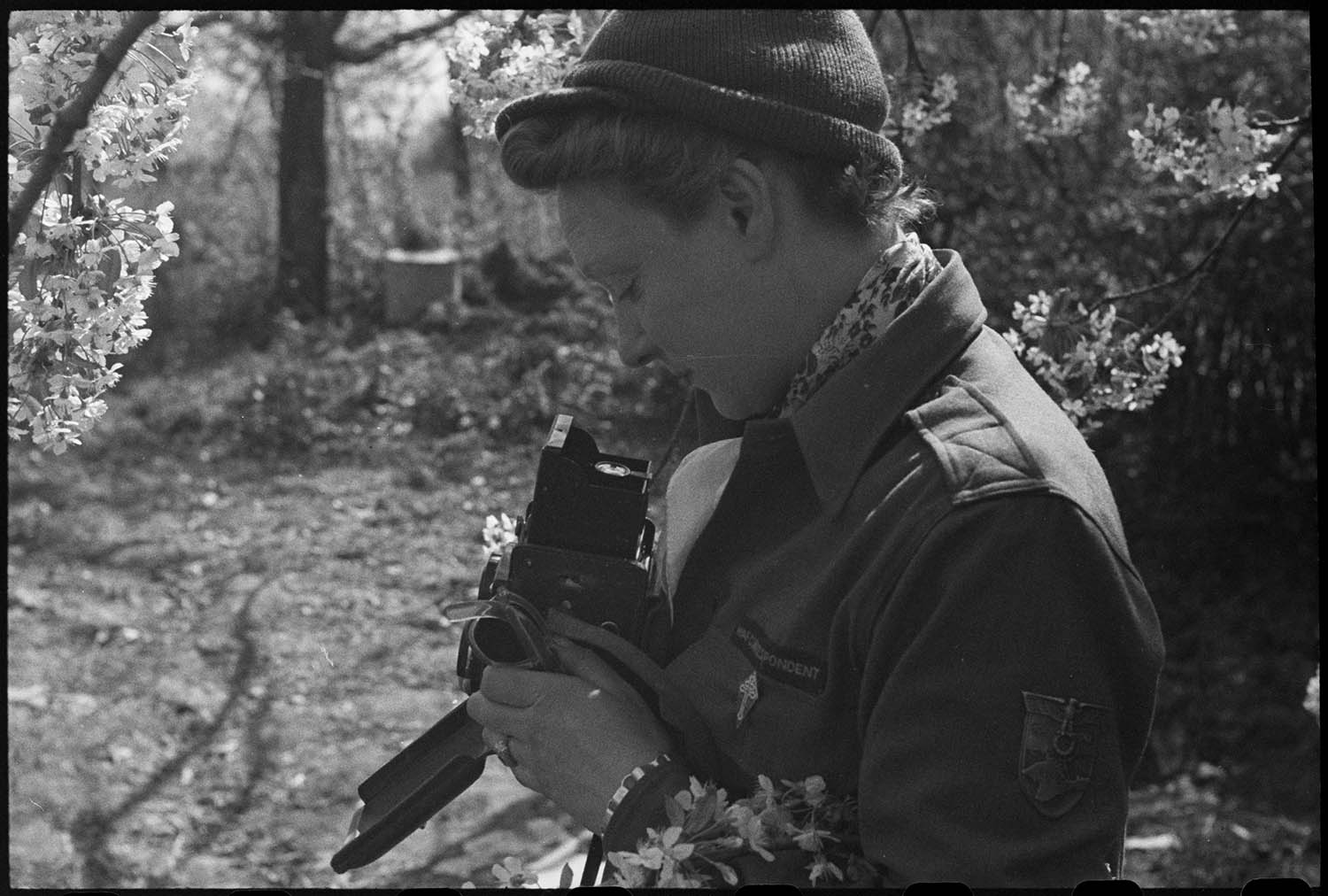 Germaine Kanova, photographe du SCA, équipée d’un Rolleiflex, Bade-Würtemberg, 11 avril 1945. © ECPAD/Défense