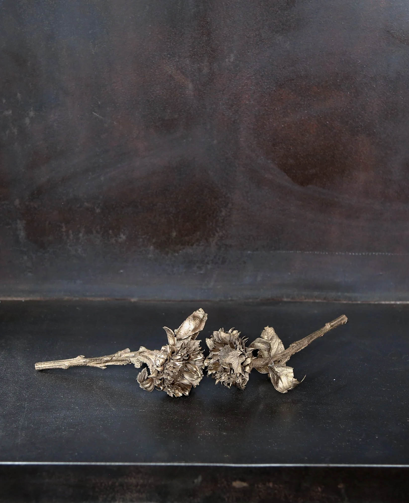 Partager Partager Sa maison-abri silencieuse et immaculée comme un linceul nous avait séduits au milieu du bruit des Grands Locos à la Biennale de Lyon. Victoire Inchauspé imagine des rituels à partir de matériaux ambivalents : cire, bronze, verre soufflé mais également de plantes et animaux transformés : pavots, tournesols, mimosas, chardons, cerfs, chauves-souris… La désintégration/la renaissance, la force/la vulnérabilité, le vivant/la mort une dualité permanente est à l’œuvre dans un entre-deux suspendu. Le spectateur est partie prenante de ces changements d’états inspirés des rythmes de la nature. Lauréate du prix Prix Sarr et du Prix Paris Photo, nommée au prix SAM pour l’Art contemporain et au Prix Sisley, Victoire Inchauspé est diplômée des Beaux-Arts de Paris en 2022. Victoire Inchauspé, crédit Blandine Soulage Rencontre à l’occasion de son premier solo show à la galerie Jousse Entreprise dont le titre « Armoires vides » est emprunté à Annie Ernaux. Chacun est invité à traverser et habiter cet espace mental qui renvoie à la mémoire intime et familiale, à ce que l’on prend ou laisse derrière soi, ce que l’on transmet, ce que l’on rejette. Comme les compartiments de nos vies, de nos mémoires. Victoire revient sur la genèse de ce projet, accompagné d’un texte de la curatrice indépendante et responsable des expositions à la Fondation Van Gogh Margaux Bonopera, les expérimentations nouvelles engagées à cette occasion, la place de la nature dans son processus créatif, le retour du piano et les étapes décisives de son parcours. Elle a répondu à mes questions. Vue de l’exposition Armoires vides, Victoire Inchauspé, Galerie Jousse Entreprise photo Max Borderie Le choix du titre « Armoires vides », que suggère-t-il ? C’est un titre que j’ai emprunté à Annie Ernaux, « Les Armoires vides », son premier roman de 1974 , et qui m’accompagne depuis le début de mes recherches pour cette exposition.à valeur de manifeste. L’armoire n’est pas un objet mais renvoie à l’idée d’un espace mental, un lieu intérieur traversé par plusieurs gestes possibles : vider son armoire, la remplir, la ranger, y piocher. Nous avons tous et toutes, un jour, vidé entièrement une armoire, voulu jeter, se débarrasser de certaines choses, tout en n’assumant pas complètement ce geste : « On ouvre, on ferme, on vide tout, puis on remet. On dit je jette, puis non. On garde. Parce que ça a touché quelqu’un. Parce que ça a été là ». Le cœur de l’exposition se situe dans cette armoire que l’on ne découvre qu’à la fin du parcours, il s’agit d’une armoire à pharmacie. Le rapport au soin traverse mon travail depuis longtemps. Il s’agit moins d’une promesse de guérison que d’une attention portée aux fragilités, à ce qui persiste malgré la blessure. Certains éléments du parcoursagissent donc en contrepoint. Au cœur de cette armoire, la dernière œuvre est The Lovers. Ce sont deux tournesols en bronze qui se font face, comme un baiser. Il existe une longue tradition de figures amoureuses dans l’histoire de l’art, du Baiser de Klimt aux multiples représentations du couple. Malgré tout il y a aussi ce plafond de verre dans l’armoire, qui va peut-être se briser et qui représente une sorte d’alerte. Margaux Bonopera l’a très justement dit dans son texte, lorsqu’elle souligne que toutes les pièces de l’exposition sont dans une sorte de tension entre le repos, l’alerte ou l’urgence. Est-ce qu’il va se passer quelque chose ? Le tournesol est une fleur récurrente dans votre travail : en quoi sa symbolique vous inspire ? C’est une forme presque obsessionnelle pour moi. Il apparaît ici pour la première fois dans les bas-reliefs, là où jusqu’à présent je fossilisais davantage le chardon ou le pavot. Le tournesol parle autant de lumière que de son envers, de l’ombre qui apparaît lorsqu’il se fane. Ces bas-reliefs sont également nouveaux par leur format et leurs patines, plus oxydées, presque altérées, la matière donne l’impression d’avoir déjà traversé le temps. Victoire Inchauspé, The Lovers, bronze, 2025 courtesy de l’artiste Par quel procédé reconstituez-vous ces fleurs ? À l’atelier, tout commence avec la terre, un matériau très simple, presque élémentaire. J’étale la matière, je découpe, je recompose progressivement une forme qui n’existe d’abord que mentalement. Je procède par fragments, comme dans une composition picturale. Je ne peins pas mais il y a dans ce travail une manière de construire l’image et de penser la surface comme un tableau. Et il y a des mains, ce sont vos propres empreintes ? Elles apparaissent comme des coups, des blessures. Je frappe la matière, je la griffe, puis je viens adoucir ces gestes avec de l’eau. Oui, ce sont mes propres mains et mes traces de doigts. Elles laissent une empreinte directe, mais retravaillée, transformée, presque mélangée. L’un des bas-reliefs, Champs de vagues, montre particulièrement ce mouvement. Pour aller vers l’introduction de la nature humaine et pour la première fois : quel a été l’élément déclencheur ? La pièce Et maintenant ? représente un enfant en terre crue, volontairement laissée à l’état brut, du grès. Il y a des craquelures visibles, ce qui montre que la terre est encore vivante, elle commence à sécher. Si le bronze est un matériau précieux et lourd, j’avais envie de le contrebalancer avec de la terre, un matériau plus cru qui est aussi d’où part absolument tout. L’enfant tient un tournesol en bronze on ne sait pas s’il vient de le cueillir, s’il veut s’en débarrasser. Certains socles suggèrent un registre plus industriel, presque en opposition ? Leur disposition dans l’espace de la galerie les rend presque domestiques, comme une étagère ou un banc. Ils accueillent notamment les œuvres en verre, qui sont s
