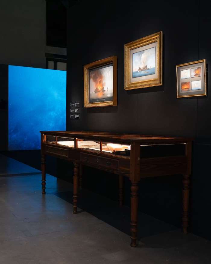 Partager Partager Pendant ces vacances de février, on va faire un tour en région à Marseille. Parmi les incontournables de la cité phocéenne, le Mucem avec Don Quichotte et Clément Cogitore (promontoire du Fort Saint-Jean) mérite le détour… Dans la « Grotte de Montesinos » avec Don Quichotte : Si la fortune littéraire et cinématographique de l’ouvrage de Cervantes n’est plus à faire, sa transposition en exposition s’avère un exercice délicat. Aude Fanlo et Hélia Paukner, les commissaires relèvent le défi sous le prisme du burlesque et du rire à partir de 200 pièces en provenance des collections du Mucem et autres prêteurs internationaux en collaboration exceptionnelle avec la Bibliothèque nationale d’Espagne. Le parcours non pas conçu comme une illustration de l’œuvre se veut un itinéraire transhistorique jalonné de surprises, « de Charybde en Scylla » pourrait-on dire face à certains obstacles qui se dressent sur la route. Vue de l’exposition Don Quichotte, Mucem, scénographie atelier Maciej Fiszer, Octobre 2025 © Nadine Jestin – Hans Lucas – Mucem Tout commence par l’évocation de la bibliothèque du noble chevalier, réelle ou imaginaire avec cet autoportrait du peintre Célestin Nanteuil sous les traits d’un fou ou les marionnettes du suédois Michael Meschke avec cette silhouette flottant ou encore les très nombreuses éditions, in folio, ex libris… sous vitrines.Les incroyables enluminures du coffret de Reinhold Metz font partie des découvertes alors que se profile l’installation de l’artiste espagnole Pilar Albarracín qui renvoie à l’épisode des bûchers de l’Inquisition espagnole « les livres au feu » mais aussi à la sottise selon le titre de l’installation et à l’absurde. Une fois ce prologue posé, les séquences du parcours sont : armures et casseroles, errances, exploits, illusions se prendre au jeu : fêtes et spectacles. Michael Kenna, Quixote’s Giants, Study 1 (Les Géants de don Quichote. Étude 1), tirage gélatino-argentique, Campo de Criptana, La Manche, Espagne, 1996 © Michael Kenna S’il est impossible de s’arrêter sur chaque œuvre entre peinture, photographie, film… de Picasso à Gérard Garouste en passant par Salvador Dali, Francisco de Goya, Pieter Brueghel ou le réalisateur Hassen Ferhani, la dérive très contemporaine de l’artiste marseillais Abraham Poincheval « En (rase) campagne » qui s’est lancé dans une performance très physique d’une traversée de la Bretagne vêtu d’une lourde armure apporte une pause bienvenue dans ce récit foisonnant. Autre transcription féministe cette fois avec Monique Wittig qui imagine avec la pièce le Voyage sans fin une version détournée de l’ouvrage de Cervantes avec uniquement des rôles de femmes comme le rappelle la photographie de « Sande Zeig dans le rôle de don Quichotte ». Vue de l’exposition Don Quichotte, Mucem, scénographie atelier Maciej Fiszer, Octobre 2025 © Nadine Jestin – Hans Lucas – Mucem La question de l’illusion est soulevée dans le chapitre par la commande passée à Claire Ananos qui s’est plongée dans les collections numériques de la Bibliothèque nationale d’Espagne pour penser l’installation immersive « La grotte de Montesinos » façon camera obscura, tandis que Gustave Doré donne une vision plus romantique du génie incompris de tous. Petit focus photographie sur le mythe des moulins à vent avec Michael Kenna et Anthony Morel adepte du Do It Youself qui confectionne son appareil photographique et a imaginé une méthode de tirage à partir de charbon conçu avec des cannes de Provence récoltées sur place. Sa démarche est la plus écoresponsable possible. Cette série « À la poursuite des 30 géants de Don Quichotte » qui capte le passage du vent dans les éoliennes est incroyable. Dans la partie consacrée aux théâtres ambulants les évocations du Théâtre de marionnettes de Maître Pierre ou la Charrette des comédiens du Tribunal de la Mort fascine et déroute. Don Quichotte n’hésite pas à sortir son épée pour se défendre des figurines selon le célèbre épisode. Danses macabres du Moyen âge, défilés carnavalesques, parades… les photographies de Cristina Garcia Rodero renvoient à ces processions religieuses et populaires de l’Espagne traditionnelle. Le parcours se termine à la fois sur Honoré Daumier, marseillais d’origine dans une vision assez pessimiste et un film inachevé d’Orson Welles très mal mis en valeur. Projet impossible aux multiples variations, ce délire qui obsède la vie du cinéaste est à l’image des tribulations et déboires du Chevalier à la triste figure. Si Orson Welles n’a pas estimé être parvenu à traduire l’anachronisme de Don Quichotte et Sancho Panza, leurs silhouettes fantomatiques continuent à inspirer de nombreux créateurs. Malgré un côté chaotique qui peut dérouter certains visiteurs, l’exposition reste un temps fort. Clément Cogitore et la camera obscura du Fort Saint-Jean : Portrait de Clément Cogitore au Mucem © Gabin Benoît, Mucem Clément Cogitore – Ferdinandea, l’île éphémère – Mucem, scénographie Benjamin Saint-Maxent, Décembre 2025 © Nadine Jestin – Hans Lucas – Mucem Avec « Ferdinandea, l’île éphémère », l’occurrence marseillaise d’une exposition dévoilée au MADRE de Naples en 2022, Clément Cogitore explore mythes et croyances populaires dans une fable spéculative basée sur des faits réels. On n’est pas loin de la lanterne magique de Don Quichotte, à ceci près que les moulins à vent ont été remplacés par une éruption volcanique ayant eu lieu en mer méditerranée en 1831 au large de la Sicile, la Libye et la Tunisie à un emplacement stratégique en termes de visée coloniale. Or, six mois plus tard cette île disparait laissant ouvertes toutes formes de projections et de spéculations. Camillo de Vito, Nouveau volcan apparu dans la mer