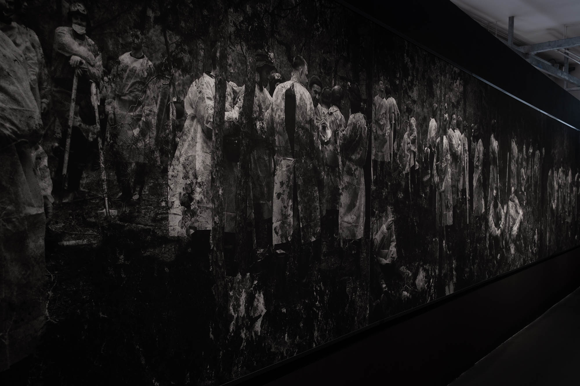 Cette scène d’exhumation, est spectaculaire par sa scénographie, sa plastique et son humanité. Les hommes bottés, coiffés et habillés de blanc sont épuisés, éreintés, psychologiquement terrassés par ce qu’ils découvrent. Mais ils sont à pied d’œuvre avec précision et attention. Rien de l’horreur n’est montré mais la forêt entière suinte de cette macabre découverte. C’est une œuvre terriblement réelle et en même temps terriblement métaphorique. La fresque impacte par sa force à nous mettre face à ces humanités fouettées par l’horreur. C’est un travail d’une grande force et d’une grande beauté, d’une certaine poésie qui décale l’actualité, se joue de plusieurs temporalités tout en documentant la violence de l’envahisseur.