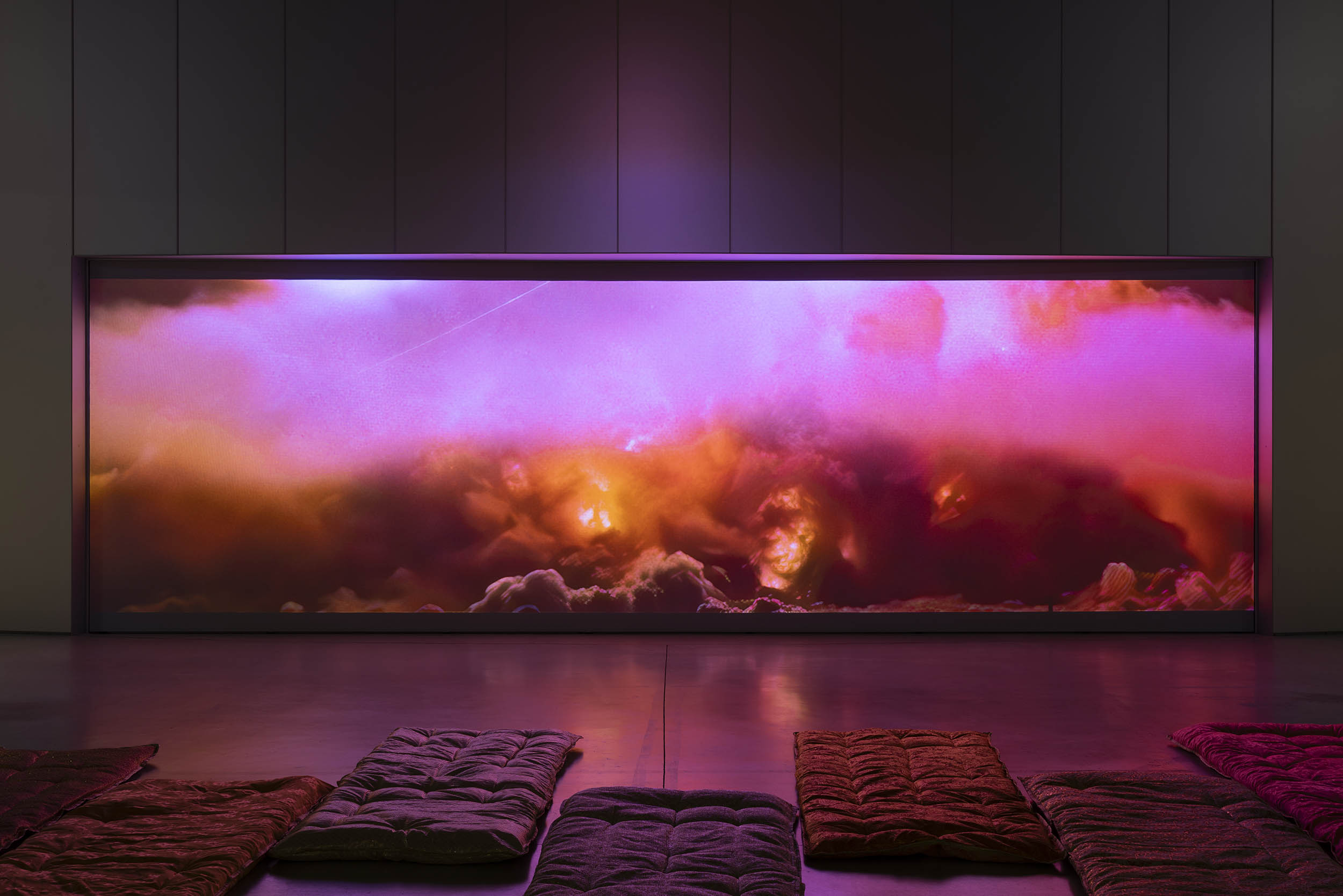 Libre choix après entre le dédale de la grotte de Philippe Parreno ou la vision crépusculaire de Victor Man. J’opte pour le sous-sol qui bat au rythme des « Peintures noires » de Goya cauchemardesques réactivées par Philippe Parreno qui a modélisé en 3D « le Domaine du sourd » que l’on traverse comme un fantôme à la lueur d’une bougie. L’artiste ouzbèke Saodat Ismailova revient sur la figure du prophète persan du 8ème siècle Al-Muqanna avec Melted In the Sun et les explosions nucléaires soviétiques au Kazakhstan avec un autre film : To the Throat of the Sun entre mythes ouzbèkes et héritage post-soviétique en Asie centrale. La voix qui chuchote comme un murmure ajoute une dimension intime et suscite une notion de transmission dans une ambiance qui révèle l’espace selon ses partis pris filmiques et scénographiques. La lenteur est au service de la puissance du récit et l’invitation à s’allonger devant l’écran permet de mieux recevoir et prendre conscience. Diplômée du Fesnoy, l’artiste installée à Paris connait une véritable accélération avec notamment une première exposition au Canada qui vient d’ouvrir.