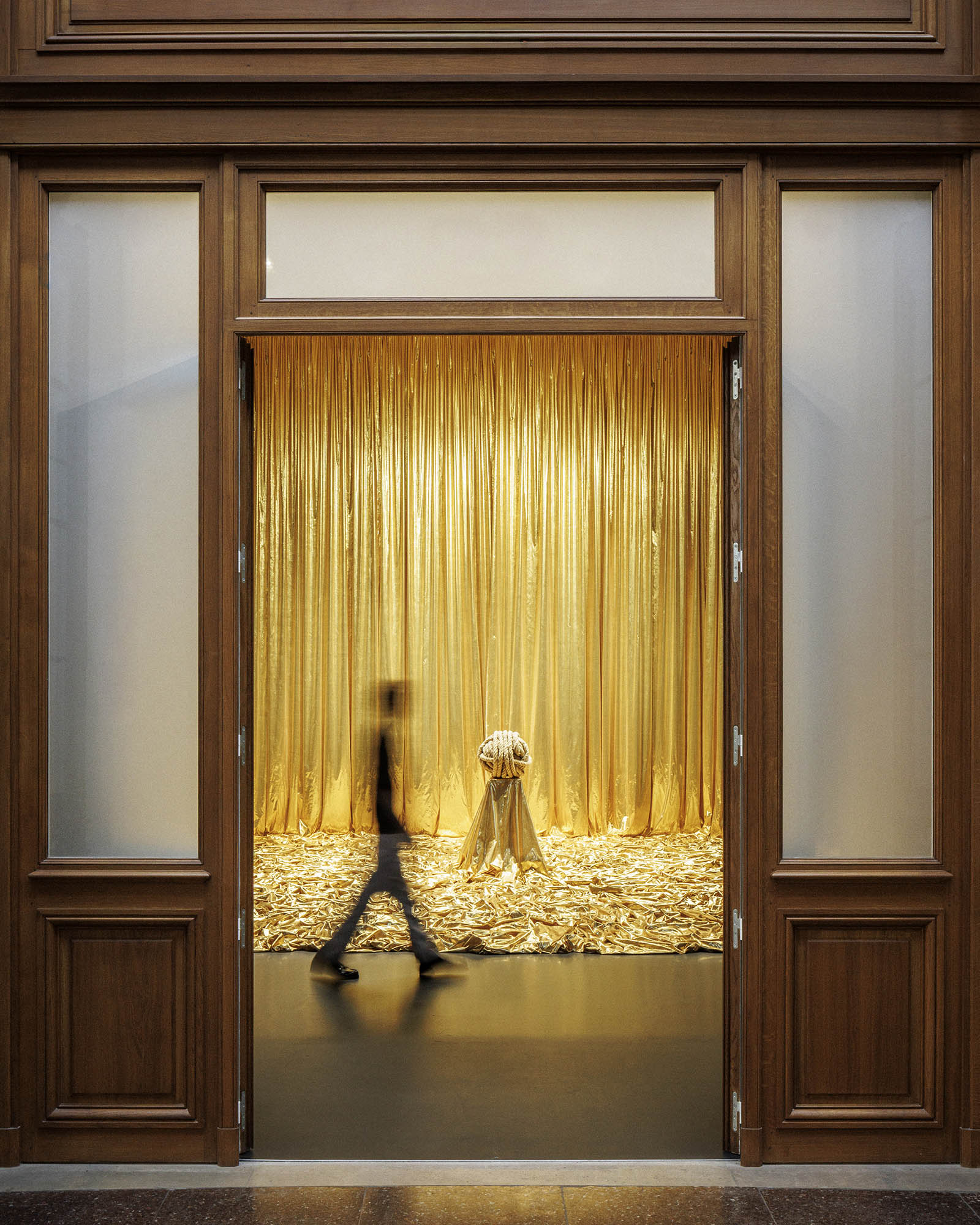 Cette part de l’inconscient et de l’irrationnel est à l’œuvre dans un parcours séquencé des entrailles de la Bourse du Commerce (nocturne) aux germinations célestes et atmosphériques des étages jusqu’à l’incandescence du feu. Le chœur de la tragédie se joue dans la Rotonde en pleine lumière avec Pierre Huyghe et le film « Camata » tourné dans l’immensité du désert d’Atacama autour de rituels de l’au-delà, ballet mécanique et temporel infini, tandis que James Lee Byars dans un ultime face à face avec la mort irradie de toutes parts un mausolée comme dans l’Égypte ancienne ou le Japon du Pavillon d’Or de Kyoto. Baroque et flamboyant.