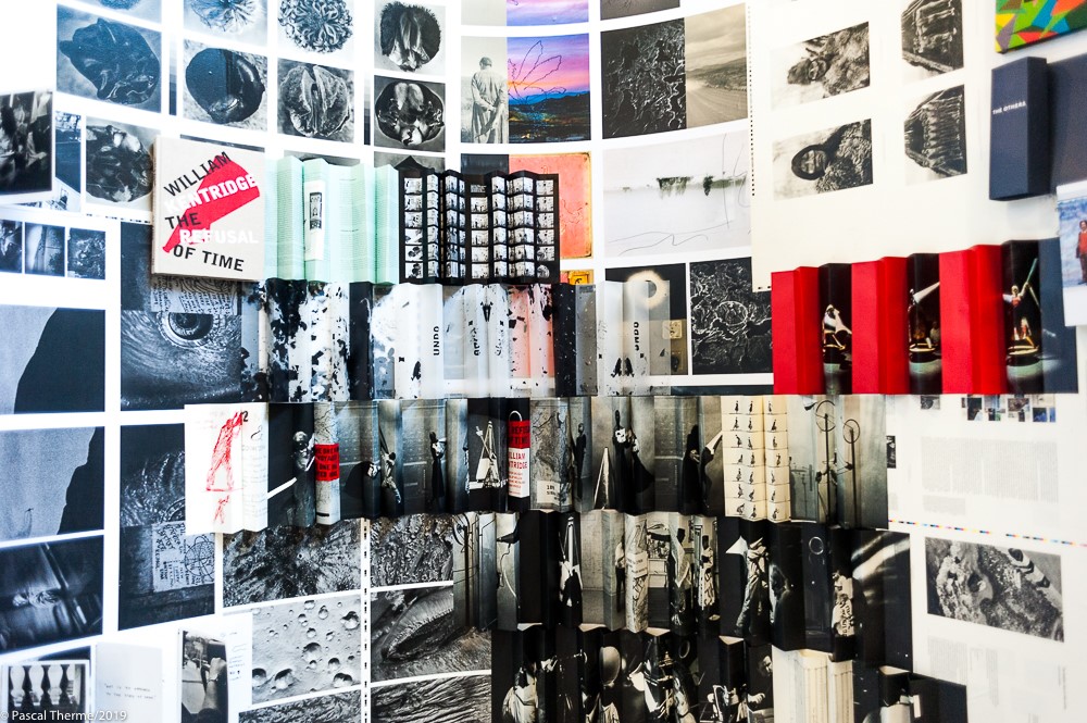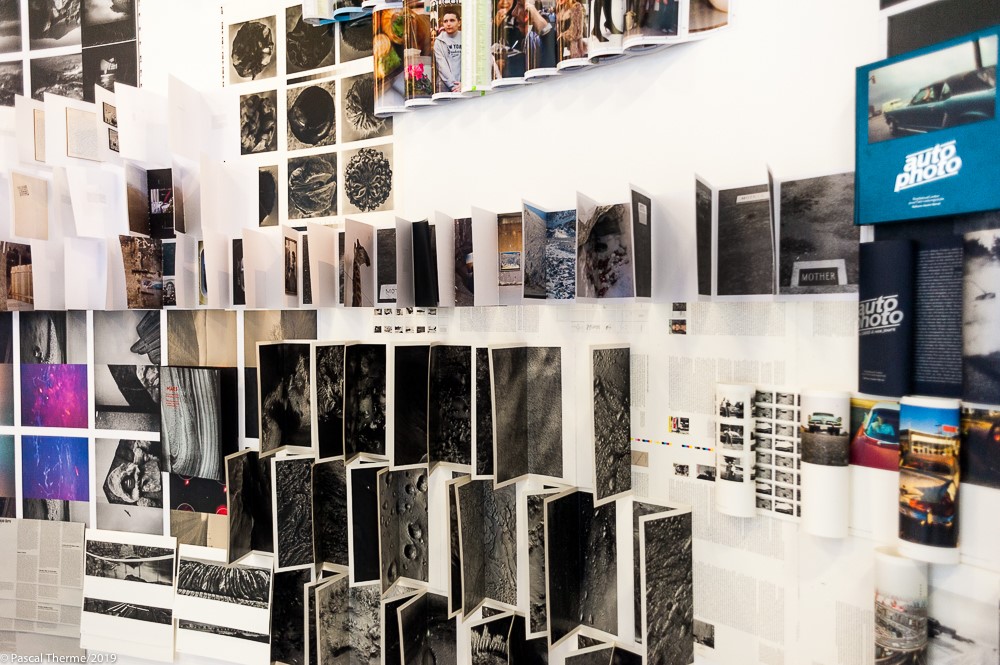 Monica Santos s’est emparée de quelques titres de l’éditeur, en a prélevé le contenu et couvert l’espace consacré avec les pages éditées en leur donnant une destination visuelle précise et différente dont elle s’explique ci dessous. Le résultat est un formidable hommage rendu à Xavier Barral, en tant qu’homme et à sa Maison d’édition. Une poétique anime le volume et le plan, disperse, assemble, associe, plie, crée des vagues, plient en carré ou arrondit les pages devenus matières, fait apparaître telle image sous ou sur telle autre, des phrases se forment, des citations se forment , des planètes, Mars, l’espace, les portraits d’Olivier Culmann, les corps de …. etc…comme un territoire sans fin, une aventure en expansion, un univers qui se dilate…