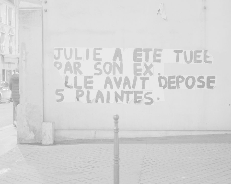 Partager Partager PhotoPortfolio Collages, une série de Noémie Coissac pour dénoncer les féminicides Ericka Weidmann13 décembre 2019 Pour ce dernier portfolio de l’année 2019, nous avons décidé de sélectionner le travail de Noémie Coissac qui a suivi des militant.es pour dénoncer les féminicides en placardant des messages sur les murs de Montreuil. Combien seront-elles à être tuées sous les coups de leur conjoints, maris, ou ex au 31 décembre ? Ce chiffre sera quoi qu’il en soit toujours trop important ! Samedi soir, 30 novembre 2019…a eu lieu une session de collages pour dénoncer les féminicides. Une trentaine de personnes se sont mobilisées ce soir là. J’accompagne trois d’entre elles sur le périphérique et dans les rues de Montreuil à la recherche du mur parfait. Noémie, cadreuse et photographe Parisienne…passionnée par l’image. Du tournage aux manifs en passant par les voyages avec une petite pincée de militantisme, Noémie aime capturer ces instants pour qu’ils perdurent dans notre mémoire. Noémie est membre de Hans Lucas. https://www.instagram.com/noemyparis/ https://www.hanslucas.com/ncoissac/photo Nous en profitons également pour partager un travail réalisé par Olivier Pasquiers qui a lui aussi suivi les traces de ces mots peints sur les murs de la capitale. Collage dans la rue par les militantes de divers associations contre le scandale des violences faites aux femmes se terminant bien souvent par des meurtres : les féminicides Collage dans la rue par les militantes de divers associations contre le scandale des violences faites aux femmes se terminant bien souvent par des meurtres : les féminicides Collage dans la rue par les militantes de divers associations contre le scandale des violences faites aux femmes se terminant bien souvent par des meurtres : les féminicides Collage dans la rue par les militantes de divers associations contre le scandale des violences faites aux femmes se terminant bien souvent par des meurtres : les féminicides Collage dans la rue par les militantes de divers associations contre le scandale des violences faites aux femmes se terminant bien souvent par des meurtres : les féminicides Collage dans la rue par les militantes de divers associations contre le scandale des violences faites aux femmes se terminant bien souvent par des meurtres : les féminicides Collage dans la rue par les militantes de divers associations contre le scandale des violences faites aux femmes se terminant bien souvent par des meurtres : les féminicides Collage dans la rue par les militantes de divers associations contre le scandale des violences faites aux femmes se terminant bien souvent par des meurtres : les féminicides Collage dans la rue par les militantes de divers associations contre le scandale des violences faites aux femmes se terminant bien souvent par des meurtres : les féminicides Des photographies pour garder une trace … Des coups, des cris, un corps s’abat … L’information, l’indignation est partout. Une femme a disparu Un cri est collé sur le mur … Un cri se décolle sous la pluie. Effacée Comment rendre compte de ces violences ? Peut-être juste se contenter de garder une trace de ces mots de révolte qui sont collés lettre à lettre, feuille après feuille ; collages presque fragiles si l’on pense à tous les slogans bombés sur les murs visibles des années après leur apparition. Comme si la révolte face à tant de violence devait restée … discrète ? sage ? … et rapidement disparaître. J’étais ému à voir ces mots criés depuis des jours de cette façon (timide ?). Alors je fais cette proposition : des images rendues volontairement pâles, déjà presque effacées mais qui resteront quand même lisibles à qui voudra bien les lire. https://olivierpasquiers.pagesperso-orange.fr/ Vous êtes photographes et vous souhaitez donner de la visibilité et de la résonance à votre travail ? Notre rubrique Portfolio vous est consacrée ! Comment participer ? Pour soumettre votre travail à la rédaction, il vous suffit d’envoyer à info@9lives-magazine.com • Une série composée de 10 à 20 images. Vos fichiers doivent être en 72DPI au format JPG avec une taille en pixels entre 900 et 1200 pixels dans la plus grande partie de l’image ; • Des légendes (si il y a) ; • Un texte de présentation de votre série (pas de format maximum ou minimum) ; • Une courte biographie avec les coordonnées que vous souhaitez rendre public (site web, email, réseaux sociaux…) Marque-page3