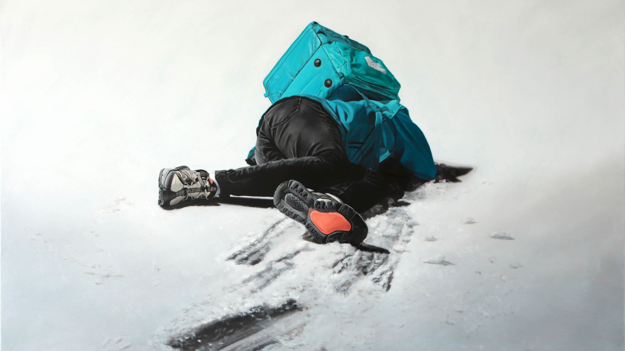 Partager Partager Véritable révélation à Art Paris (focus Hervé Mikaeloff) alors qu’il est encore étudiant aux Beaux-Arts de Paris, Arnaud Adami n’était pas au départ destiné à une carrière artistique. Après un bac technologique qu’il finance par un emploi dans une usine de colis postal, il décide de tenter une classe préparatoire à Châteauroux, un pari qui s’avère décisif. Puis il intègre successivement les écoles des Beaux-Arts de Bourges et de Paris dans l’atelier de Nina Childress. Je le rencontre à l’incubateur Poush qu’il rejoint avec l’artiste Dhewadi Hadjab, rencontré aux Beaux-Arts de Bourges. Arnaud Adami, Sans titre, 2020 courtesy de l’artiste Il n’est pas livreur lui-même alors que ce sujet, omniprésent dans ses toiles pourrait le faire croire. Ce sont les travailleurs invisibles de notre société capitalistique globalisée à qui il souhaite redonner une humanité. La question du déguisement et sa connotation l’intrigue et le motive tout particulièrement. « Quand je parle de mes livreurs, je parle de leurs costumes. Leur métier est souvent autre mais dès qu’ils revêtent cet habit, ils revêtent un rôle social » résume-t-il. Comme deux univers étanches qui se croisent, à l’image de son parcours, entre l’usine et le monde de l’art. Une dualité où la question du symbole permet ce point de bascule comme le décrit le penseur Arthur Danto qu’il cite. Autre source d’inspiration, le photographe August Sander et sa classification sociologique qui l’inspire quand il commence à saisir ses camarades manutentionnaires dans différentes usines de la région de Bourges. C’est en arrivant à Paris qu’il réalise que ces livreurs à vélo sont les nouveaux visages de ce monde prolétaire 2.0. Le témoignage de Jules Salé dans le livre « L’exploitation à la cool » sorti en mai 2020 rejoint ce réalisme brutal mais aseptisé qu’il traque dans les moindres détails et accessoires, l’ubérisation fonctionnant par des codes immédiatement reconnaissables. Les grands thèmes de l’histoire de l’art, comme la chute d’Icare l’ont précédemment conduit à imaginer cette série de livreurs Deliveroo abandonnés et prostrés dans la neige ou percutés dans leur course folle. Cette codification pyramidale de la peinture française classique se retrouve dans le portrait d’un autre livreur dont la silhouette en pied renvoie directement au costume de sacre du roi Louis XIV par Hyacinthe Rigaud, conservé au Louvre. La nature morte et la scène de genre flamande l’inspirent également beaucoup comme dans cette œuvre en préparation où une veste orange fluo de la marque de livraison Just Eat a été jetée au sol d’un intérieur bourgeois, contradiction qui interpelle d’autant plus. Il avait déjà soulevé cette dichotomie avec le portrait du livreur Deliveroo réalisé dans le bureau de Jean de Loisy comme il me le confie, alors que ce livreur est étudiant aux Beaux-Arts de Paris. La toile a immédiatement trouvé preneur à Art Paris. Une dérive fictionnelle qu’il pousse jusqu’à représenter une femme livreuse alors qu’elles ne sont pas nombreuses dans ce métier et qui, de plus, serait voilée. Arnaud Adami, Sans titre, 2020 courtesy de l’artiste Sa méthode consiste d’abord à de mises en scène très contrôlées qui donnent prétexte à des photo-montages avant de passer à la peinture en tant que telle. Entre plaisir du détail et plaisir du geste, il alterne petit et grand format. Sa prochaine recherche, après les bouchers de Ringis qui penchent du côté de Rembrandt ou Chaïm Soutine ou les livreurs, concerne les éboueurs de Paris avec leurs costumes aux couleurs fortes, prétextes à d’autres recherches autour des opposés chromatiques. Cherchant à s’inscrire dans son époque, il reproduit ces effets fluos et flashs que l’on retrouve dans ces compagnies globalisées, soulignant leur omniprésence dans notre quotidien, à tel point que la mode a jugé bon de s’en emparer à son tour. Arnaud Adami, Sans titre, 2020 courtesy de l’artiste L’artiste ne revendique pas un message anti capitaliste et parle de codes inconscients qui interviennent dans ses choix de motifs et de composition. Il n’est pas encore représenté en galerie préférant temporiser et prendre une certaine distance, pouvant enfin se dédier exclusivement à sa passion, la peinture et en vivre. Arnaud Adami fait partie de l’exposition collective Théâtre des Expositions, Saison 2 aux Beaux-Arts de Paris, Natures Mortes à la galerie Valérie Delaunay et à la galerie Sabine Baysali autour de la thématique de l’Enfer par Olivier Masmonteil, commissaire. INFOS PRATIQUES : Natures mortes, exposition collective du 18 novembre au 24 décembre 2021 Galerie Valérie Delaunay 42 rue de Montmorency 75003 Paris L’Enfer, exposition collective du 27 novembre 2021 au 22 janvier 2022 Galerie Sabine Baysali 99 rue du Temple 75003 Paris Site internet de l’artiste : www.arnaudadami.fr Marque-page0