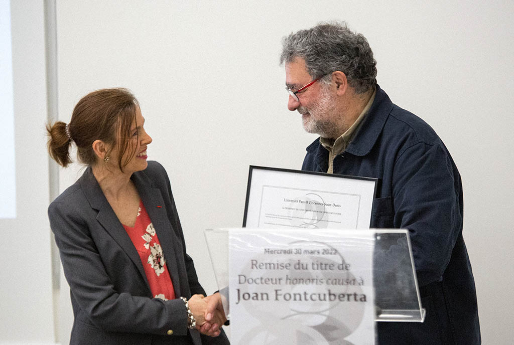 Partager Partager La semaine dernière, Annick Allaigre, présidente de l’université Paris 8 a remis le titre de Docteur Honoris Causa au photographe et artiste espagnol Joan Fontcuberta. Cette distinction du Doctorat Honoris Causa salue une œuvre visionnaire, ayant pressenti de nombreuses problématiques logées au cœur de notre contemporanéité, et qui poursuit son auscultation de nos mutations sociales à travers le foisonnement des images. Né à Barcelone en 1955, Joan Fontcuberta est un artiste visuel de renommée internationale, mais également enseignant, critique, commissaire d’exposition et historien. Son œuvre interroge les régimes de vérité produits par l’image, sur les dispositifs du croire et du faire croire, de la dualité fiction/réalité. Dans ce domaine, il a été pionnier, préfigurant les questionnements aujourd’hui si actuels autour de la crédibilité des images qui nous entourent, de leur potentiel de manipulation, ou encore de la crédulité du public. L’œuvre de Fontcuberta a une visée revendiquée de pédagogie, d’exercice de l’œil critique du spectateur. Aussi ne faut-il pas se laisser piéger par un humour facétieux que l’on retrouve au sein d’œuvres comme Spoutnik ou Miracles et cie : son œuvre a une portée éminemment politique. L’humour et le détournement sont les armes d’une solide pensée critique, qui interroge par là même la séduction, et la possible trahison, de l’image. Dans ses derniers projets, il s’est intéressé à la nature et à la fonction de l’image dans la culture numérique, et à la transition de la photographie, d’objet solennel ou archivistique à la dimension éphémère de l’image numérique. Il analyse constamment ce glissement de l’instant décisif qui fixe la mémoire, dans la photographie argentique, à l’instantanéité de photos quotidiennes, où l’acte photographique est banalisé et l’image n’existe que pour que nous existions sur les réseaux. Michelle Debat, Joan Fontcuberta et Annick Allaigre lors de la Remise du Docteur Honoris © Université Paris 8 – Pôle création audiovisuelle. Mars 2022 Récompensé par de nombreuses distinctions en Allemagne, en Suède et en Espagne, il a également été fait Chevalier de l’Ordre des Arts et des Lettres, par le Ministère de la Culture français en 1994. Il a enseigné aux beaux-arts de Barcelone, et été invité dans de prestigieux établissements, parmi lesquels l’University of Wales au Royaume Uni, le Fresnoy en France et Harvard aux États-Unis. De nombreuses expositions personnelles ont célébré son travail dans le monde entier, au MoMa de New-York, au Museum of Fine arts de Fukui (Japon), à la Maison Européenne de la photographie à Paris. Auteur de plusieurs essais sur la photographie, dont le passionnant Le baiser de Judas. Photographie et Vérité (Actes Sud, 1996) ou encore Le Boitier de Pandore. La photographie après la photographie (édition Textuel, Paris, 2017), Joan Fontcuberta continue d’explorer les mutations des images, dans une démarche de recherche et création, mais aussi de transmission et de pédagogie. http://www.univ-paris8.fr Marque-page0