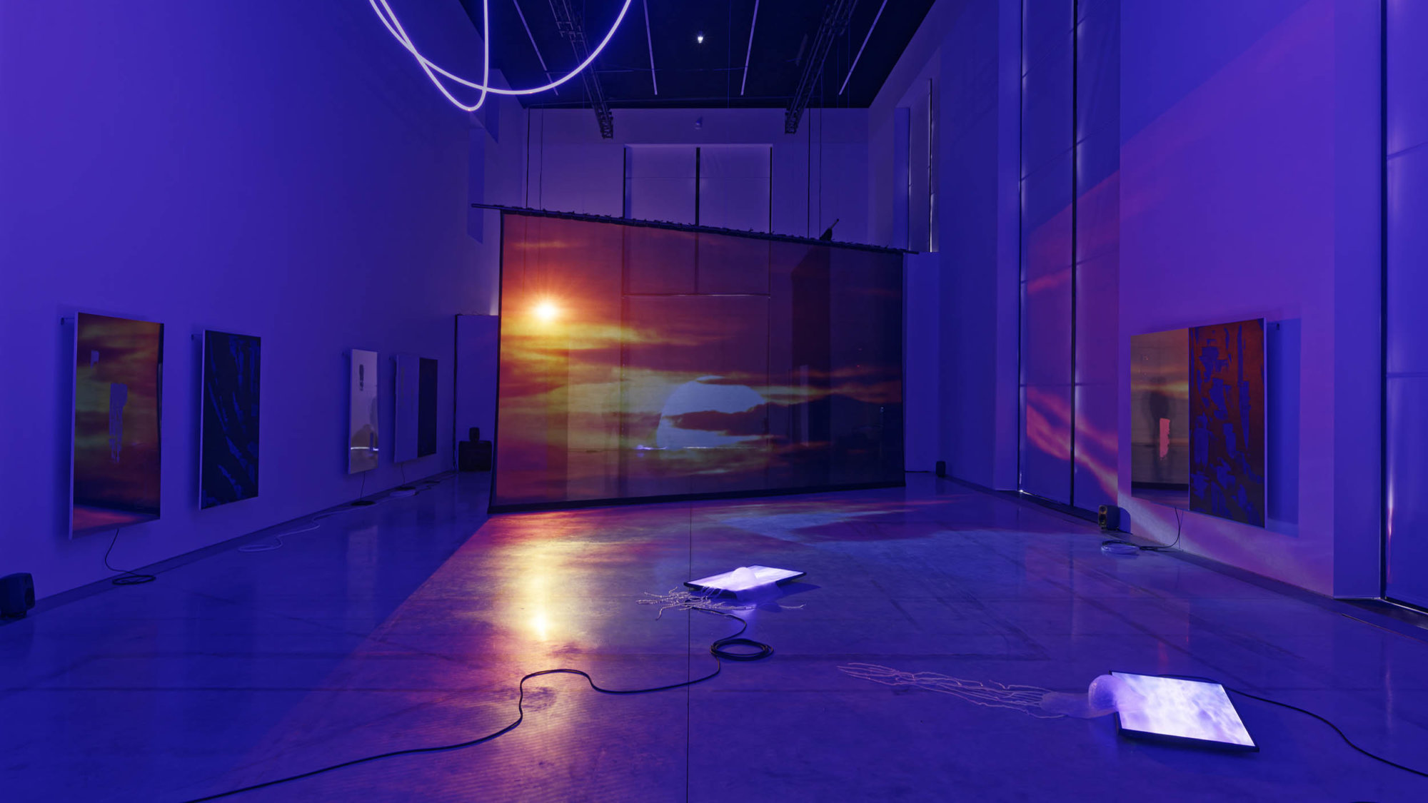 Partager Partager J’avais rencontré et interviewé Hoël Duret à l’occasion de la foire Around Video Art Fair autour de son film Drop Out, tourné en Nouvelle Zélande pendant le confinement et étais impatiente de découvrir le nouveau volet du cycle Low au CCC OD à Tours à l’invitation d’Isabelle Reiher, la directrice. Œuvre totale et expérience immersive inédite, Cont#ct nous fait basculer dans un monde parallèle entre récit d’anticipation et pulsion scopique et additive à la beauté pré-formatée. Nous partons sur les traces d’une mystérieuse exploratrice dont la voix nous guide et nous déroute en même temps. Hoël Duret revient sur le défi que représentait la Nef du CCC OD et la formidable opportunité de cette exposition construite avec la commissaire Delphine Masson. Il a répondu à mes questions. Né en 1988, Hoël Duret est un artiste diplômé de l’Ecole des Beaux-arts de Nantes. Son travail a été présenté en France lors d’expositions personnelles à la Fondation Louis Vuitton, au FRAC des Pays de la Loire, au centre d’art Galerie Edouard Manet, Gennevilliers, à la Zoo Galerie, Nantes, ainsi que lors d’expositions collectives au Centre Georges Pompidou, au Palais de Tokyo, au Palais Garnier – Opéra de Paris, au CAPC Musée de Bordeaux, aux FRAC PACA et Nord-Pas de Calais et dans les centres d’art Passerelle à Brest et CREDAC à Ivry. A l’international son travail a fait l’objet d’expositions personnelles à la Villa Merkel, Esslingen, Allemagne, au Palazzo Strozzi, Florence, Italie, au Palazzo delle Stelline, Milan, Italie, à Yishu 8, Beijing, Chine et a rejoint des expositions collectives au Séoul Art Museum, Corée, au MUDAM, Luxembourg, au Tel Aviv Art Museum, Israël, au Ford Theatres, L.A., USA et à Martos Gallery, L.A., USA. Il a participé à plusieurs programmes de résidence parmi lesquels le Pavillon Neuflize OBC / Palais de Tokyo, Paris, Te Whare Hera, Wellington, Nouvelle-Zélande, Yishu 8, Beijing, Chine, Saint Ange, Seyssins, France. En 2020 son travail a rejoint les collections du Centre Pompidou. Il collabore avec la NEW GALERIE, Paris, où il a présenté sa première exposition personnelle en janvier 2022. Hoël Duret « Cont#ct » vue d’exposition au CCC OD, Tours, France, avril2022 © Photo(s) : Aurélien Mole En quoi votre résidence à Wellington (Nouvelle-Zélande) a -t-elle été déterminante pour l’exposition Cont#ct au CCC OD dans le cadre du cycle Low ? Ma résidence à Wellington en Nouvelle Zélande au printemps 2020 a été une bascule dans le cycle de projets et d’expositions Low dont Cont#ct est la dernière occurrence à ce jour. Dans la mesure où je me suis retrouvé bloqué là-bas au moment du confinement, j’ai dû adapter mes outils et processus de travail et faire entrer de nouvelles composantes dans la démarche de façon à réaliser ce film, contre vent et marée. Pour cela, j’ai eu recours à de nouvelles techniques et outils numériques, ce qui a orienté le projet Low dans son ensemble vers un aspect plus technologique. Quels sont les enjeux de ce cycle ? Low, initié en 2019 est une sorte de grand palimpseste, un projet que j’avance par petites touches d’expositions en expositions films, peintures, installations… Je viens ainsi dessiner une sorte de paysage de ce que représente Low, un monde parallèle au notre, qui y ressemble beaucoup mais dans un rapport très intense au numérique que j’accentue par endroits tout en restant assez low-tech et bricolé paradoxalement. S’il y a beaucoup d’éléments assez spectaculaires à partir de technologies assez pointues, je n’y ai pas recours obligatoirement. Low se situe sur ce fil entre aborder un monde numérique très sophistiqué, sans basculer dans le tout technologique. Hoël Duret « Cont#ct » vue d’exposition au CCC OD, Tours, France, avril2022 © Photo(s) : Aurélien Mole Quels sont les ressorts narratifs et formels de Cont#ct ? Cette exposition se tient dans l’espace de la Nef, un espace de 300 m² avec un plafond de 11m de haut, ce qui représentait un vrai défi. La première chose que j’ai souhaitée était d’occulter complètement cet espace en général pensé pour sa porosité avec l’extérieur via les grandes baies vitrées. L’idée était de faire un geste très fort à partir d’un dispositif total et totalement immersif, les œuvres interagissant toutes ensemble car pilotées par le même programme. Elles ne sont pas dissociables les unes des autres, c’est pourquoi il n’est pas donné au visiteur de plan de salle ou de titres aux œuvres. Cette installation a un cycle d’une durée de 16 mns. La place de la bande son de l’exposition La bande son a été écrite avec le compositeur Vincent Malassis qui m’accompagne sur le projet Low depuis plusieurs étapes. Il avait réalisé la musique du film Drop Out ou de l’exposition Outta Luck qui s’est déroulée à la New Galerie à Paris en janvier 2022. Ensemble nous collaborons à travers l’écoute de nombreuses sources, l’écriture de rythmes, de moments et de séquences, en fonction de mes prérequis pour qu’ensuite il puisse me faire un certain nombre de propositions. Cette fois et contrairement aux expériences précédentes, la musique a été composée très en amont de l’exposition, avant la vidéo, avant l’animation lumineuse de la Nef. Puis assez tardivement, j’ai décidé d’ajouter une voix qui parle dans l’espace et qui vient se superposer à la musique. Cette voix joue un texte que j’ai écrit agissant comme une sorte de fil rouge pour le spectateur, de sorte à donner quelques clés sur l’endroit où l’on se trouve. Par ailleurs et peut-être de manière contradictoire, cette voix parle en anglais, ce qui est volontaire, la traduction du texte étant remise au visiteur même si cela introduit une légère dissonance. Pour arriver à cette voix nous avons travaillé avec une chanteuse 